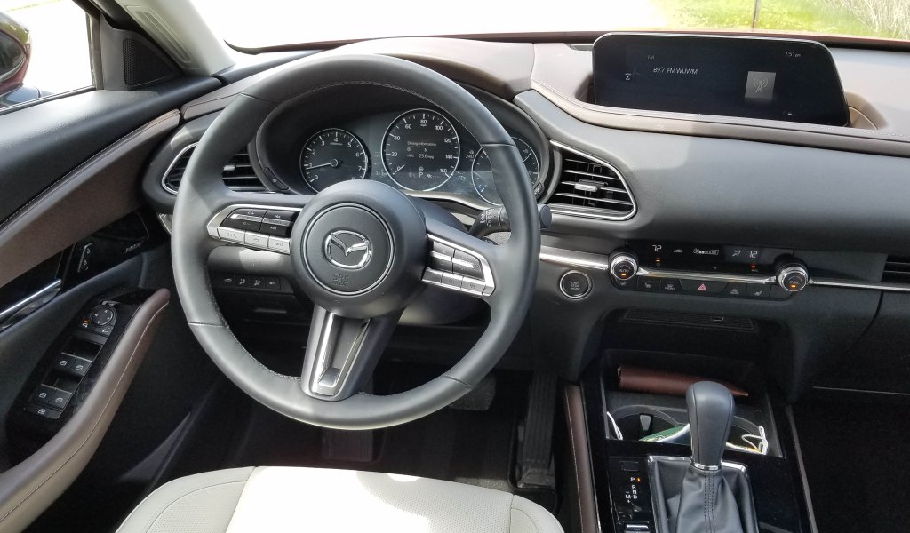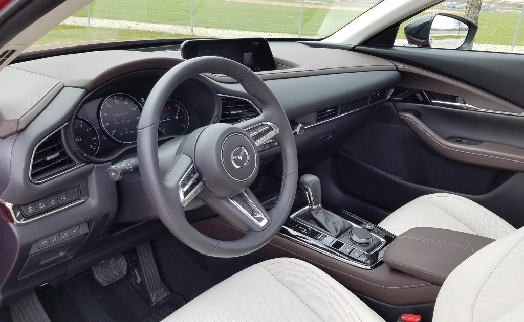 Like the previous CX-30 I’d tested, this one had a gorgeous leather interior, creamy white seats and brown over black dash with soft brown door armrests and insert trim. That brown on the dash wraps into the door trim creating an especially snazzy look. Trim on the dash and door handles is satin chrome and Mazda includes a leather wrapped gear shift knob and steering wheel. Just wish the wheel was a racier flat-bottomed number.