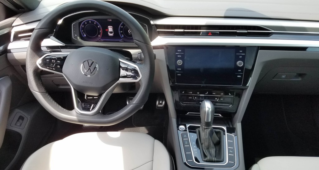 VW loads up Arteon with electronic safety devices, including parking sensors, automatic high-beam headlights, and an integrated crash response system to alert authorities if you crash. There’s also the standard blind-spot warning, smart cruise control, rearview camera, lane-keeping assist, and emergency braking with pedestrian recognition.