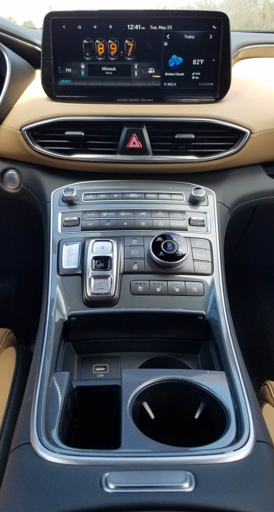 Hyundai includes a big dial on its console that blends with a center stack to engage various drive modes. Comfort is best around town and Sport for the freeway, at least when merging onto it. Snow and Smart modes also are available.