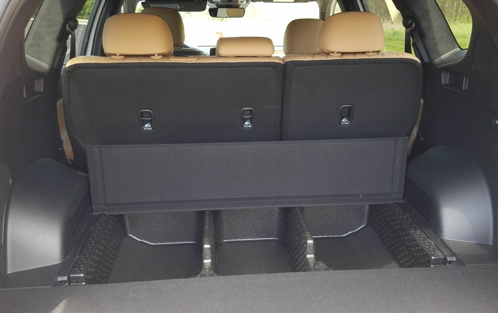 There also are manual sun screens for the rear seat’s side windows and a huge storage area behind the second row seats, including large bins under the floor. Hyundai claims 36.4 cubic feet of space and that’s believable. Put the rear seats down and that expands to 72 cu.ft. That’s better than even some larger SUVs.