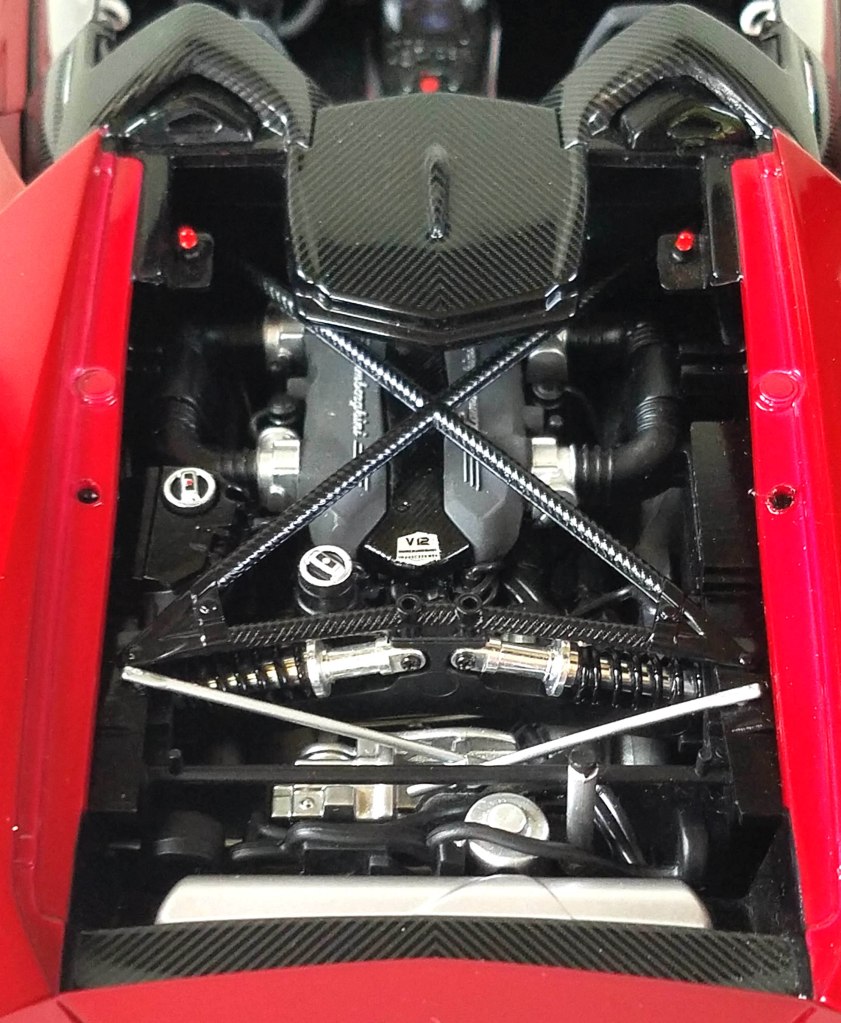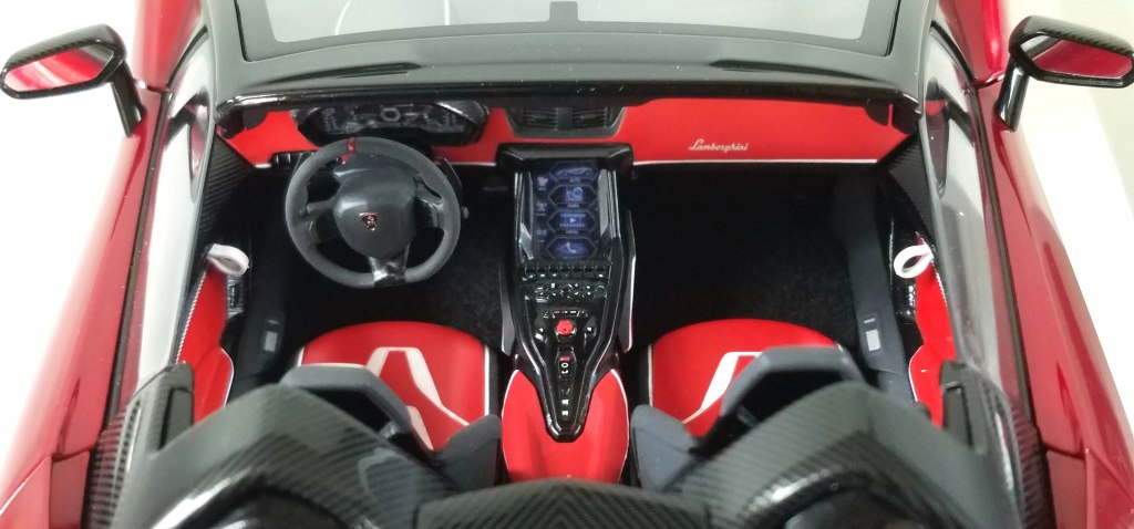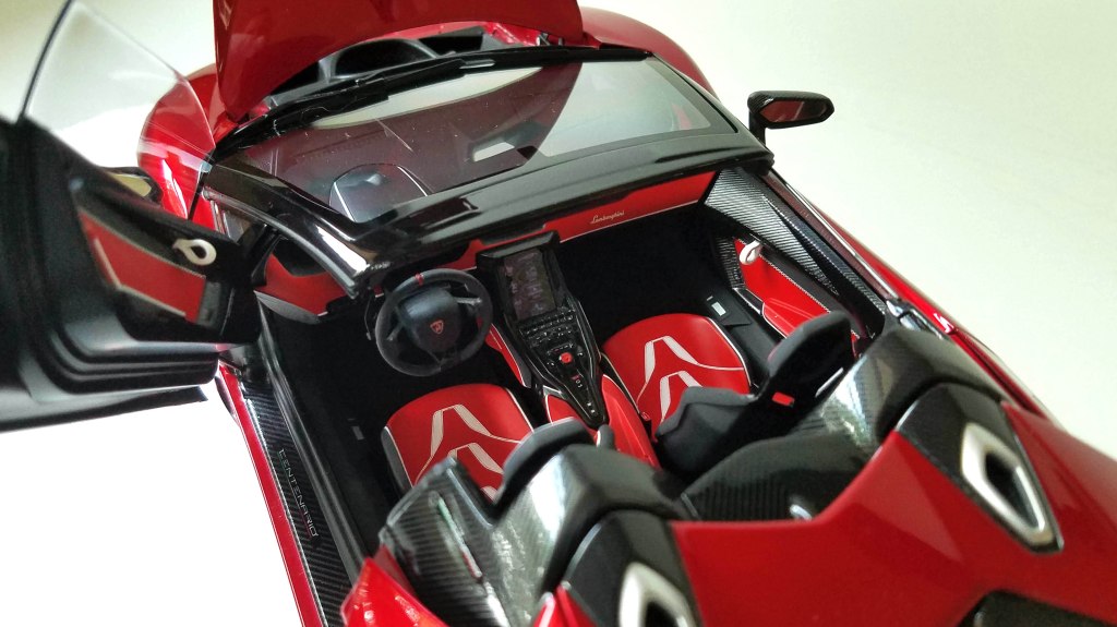 Inside is a beautiful red interior with a white v-shaped pattern on the seats, a steerable flat-bottom steering wheel with red 12 o-clock stripe and Lambo logo on the hub. That big info screen looks shiny and realistic while the console it blends into features oodles of buttons. Autoart creates a sharp black instrument panel pod too and the door panels are exquisitely detailed, including a white loop on each door to help pull the doors down and latched. Inside tops of door panels also appear to be carbon fiber. Snazzy!