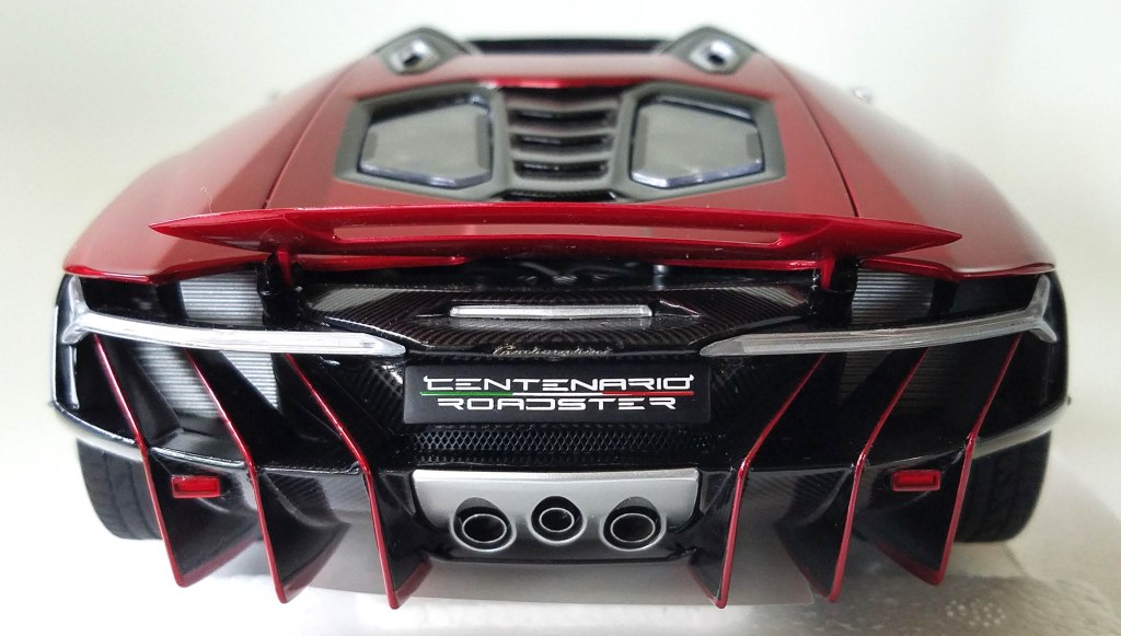 There are the clear-bar exposed taillights and then tiny red brake lights below, between the six red-edged diffuser fins that otherwise appear as carbon fiber. Behind those, tucked under the body’s tail with deployable rear wing are big silver radiators. Then down low between the two innermost diffuser fins are three silver exhaust outlets. And in case you’ve forgotten the car’s name, Centenario Roadster is spelled out between the Lamborghini-labeled flap that separates the light bars.