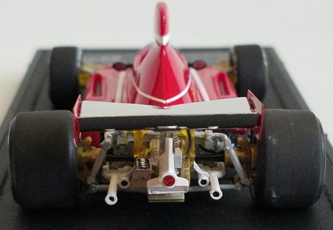Beyond the suspension detail is the snazzy looking engine bay with battery, low tailpipes and again brake air ducts in the exposed engine area beyond the car’s body. The Ferrari’s white wing strut looks substantial too and there’s a rear red light embedded in that, used during rainy races and on warmup laps to alert drivers of the car ahead. There’s even some wiring on the engine, pretty rare in this scale.