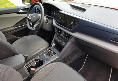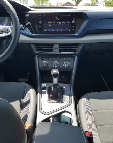 The test Taos featured gray seats with white stitching and the doors were two-tone gray while the dash was mostly dark gray with a bluish trim on some plastic bits. The console was flat black, ending sunny day reflection worries.