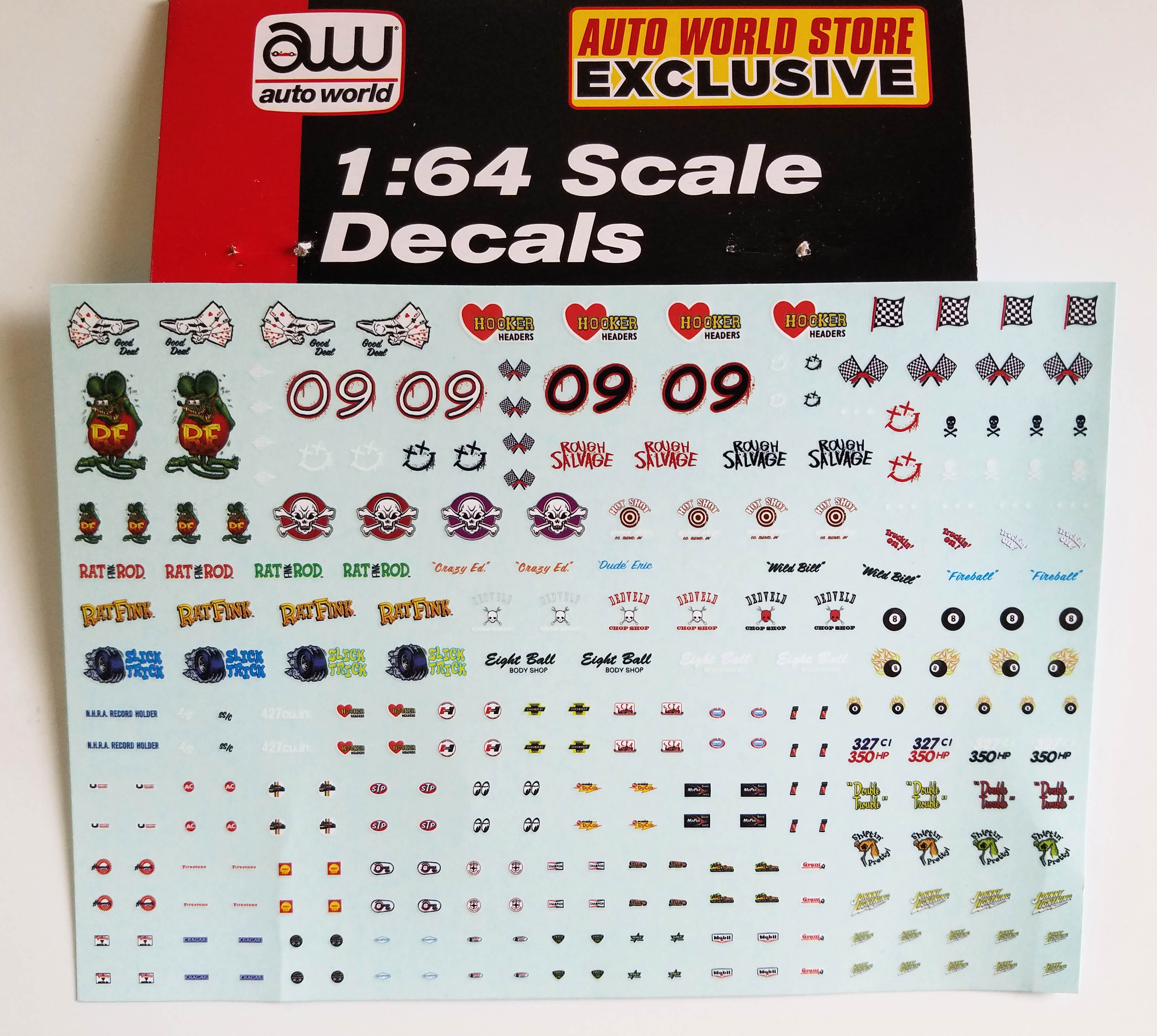 Note: AW also has introduced decals for you to use to soup up and customize your favorite muscle cars, etc. The sheet has a little of everything from Johnny Lightning and Mobil decals to numbers and decals that say Rat Fink, Rad Rod, etc. Yes, Mooneyes, STP and Chevy are also here among many others. Just $9.99 and you could do up a bunch of your 1:64 collection.