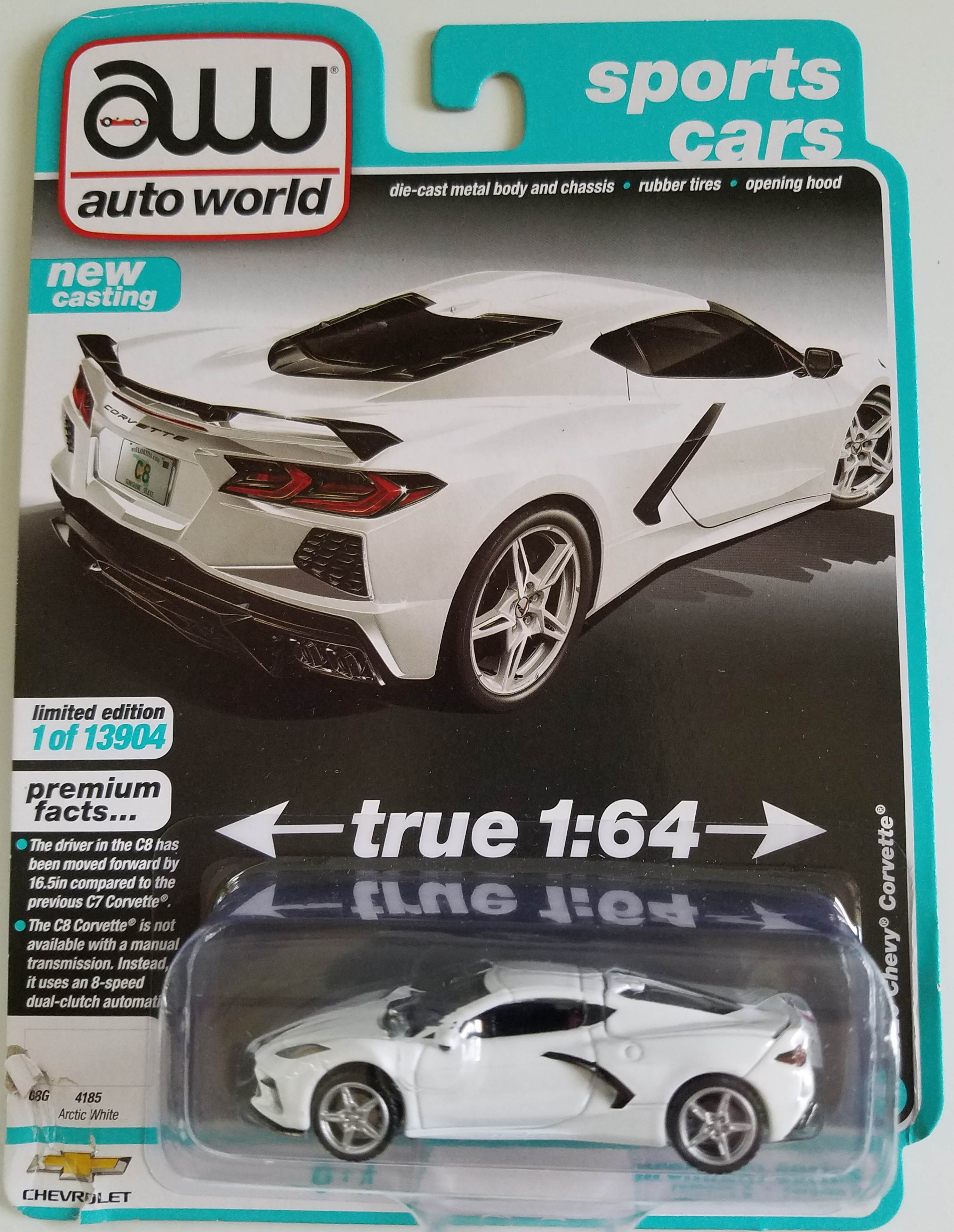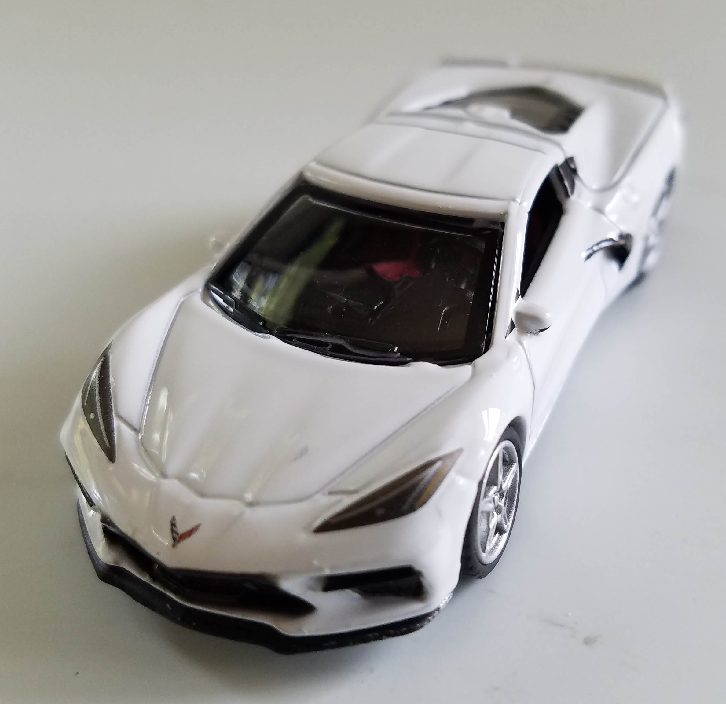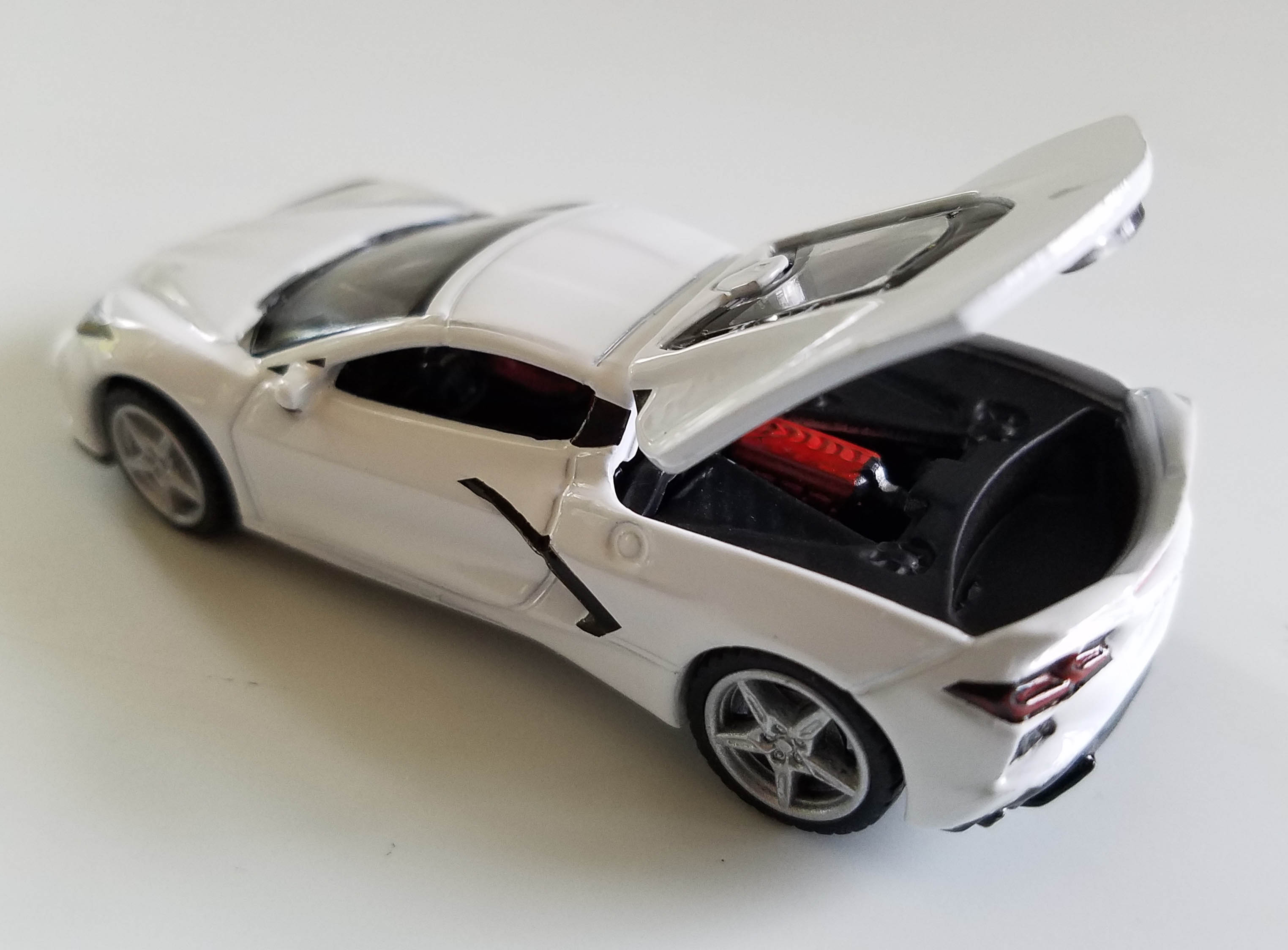 This new C8 Corvette looks particularly sharp in white as the color accents its chiseled good looks from that piercing nose to its muscular flanks, plus a slightly flared rear spoiler. As with its front-engine 1:64 models, the mid-engine Vette’s rear deck easily pops open to reveal its V8. The nice part is that with a big rear window you can see the orange engine block whether the deck is raised or closed.