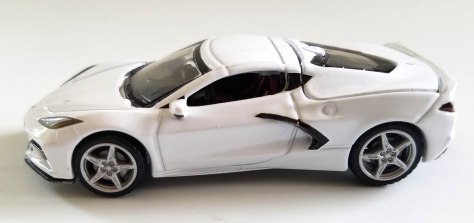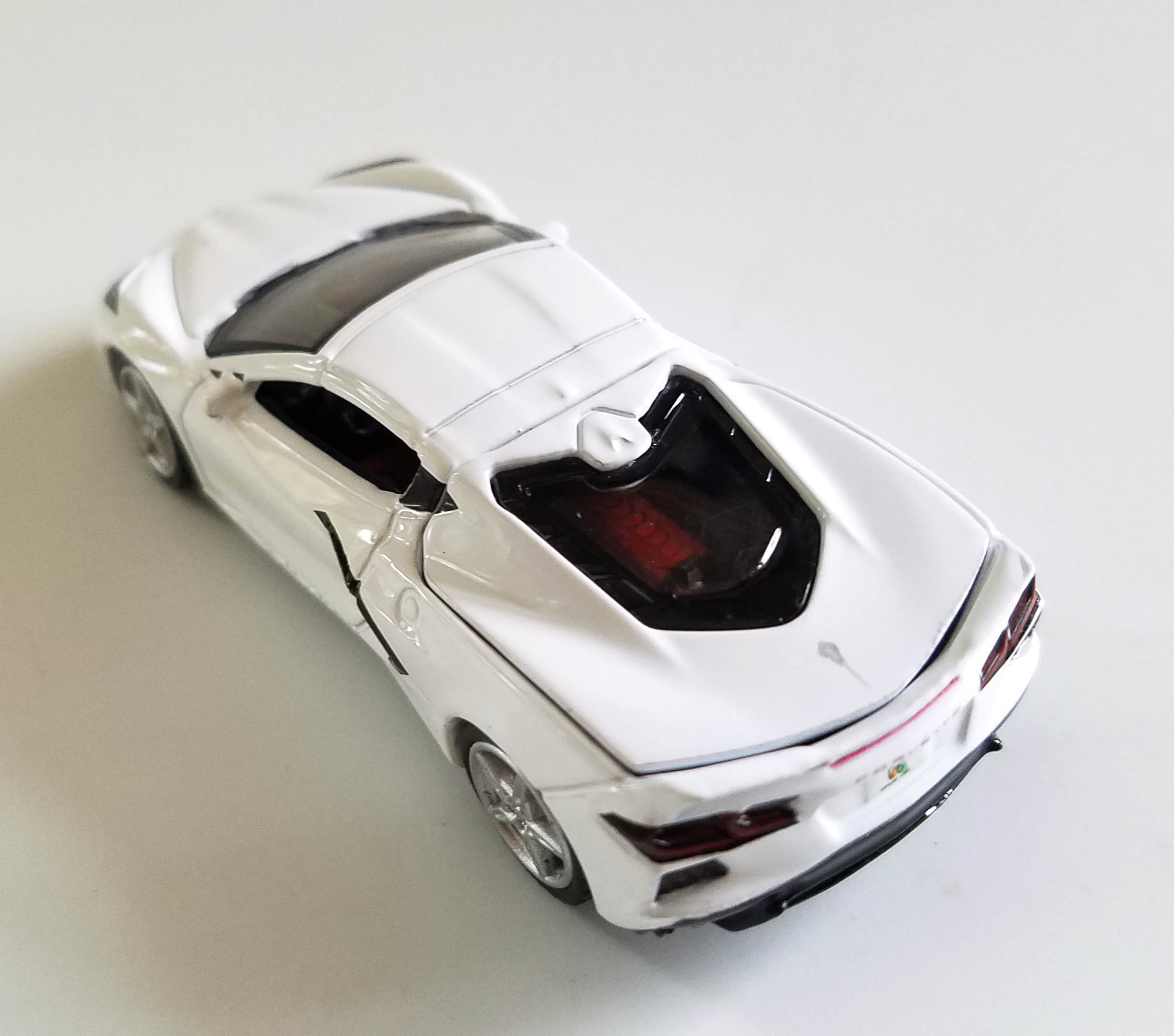 I like that there are tiny molded-in mirrors at the A-pillars, the sculpted air vent openings behind the doors, accented with black paint, rear diffuser and chin spoiler, also both painted black, which sets them off on the white model. Head and taillights are painted, but properly shaped and there are two sets of dual exhausts protruding from the diffuser. The rear license is a Florida plate with C8 emblazoned on it, but you may need a magnifying glass to read it.