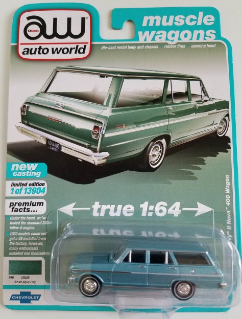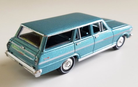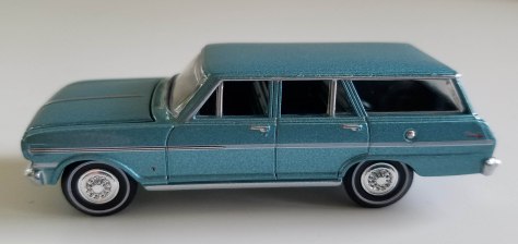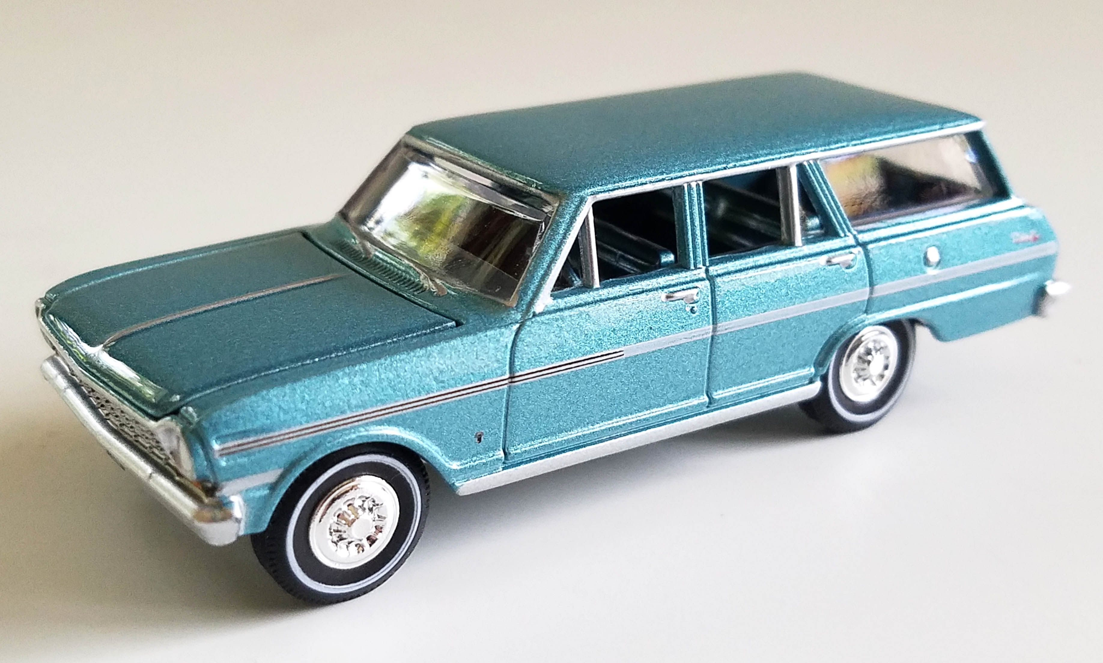 The sample Azure Aqua Poly Chevy II Nova 400 Wagon has no wheel issues and rolls easily, plus it looks terrific in all its boxiness. Tires are rubber treaded whitewalls and the hub caps chrome for a little flash.