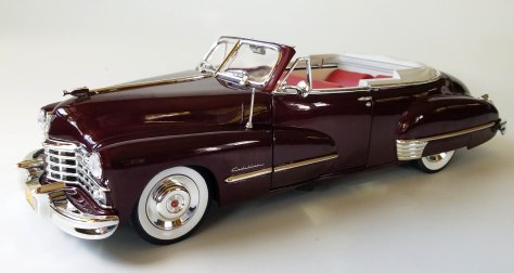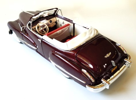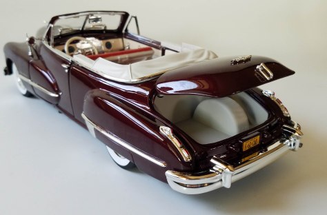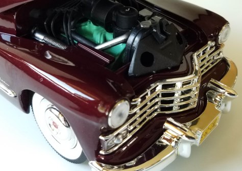 Chrome here, as it was in 1947, is nearly overpowering, but certainly adds a high bling level to the Series 62. The nose and tail are dripping with it via those bumpers, the grille, Caddy insignias and hood ornament. Plus this model includes a bold chrome trim line from the front wheel to mid-door at the end of the bulging fenders that wrap into the doors. Likewise there are chrome stone guards and trim on the rear fenders from in front of the rear wheel to just behind it.