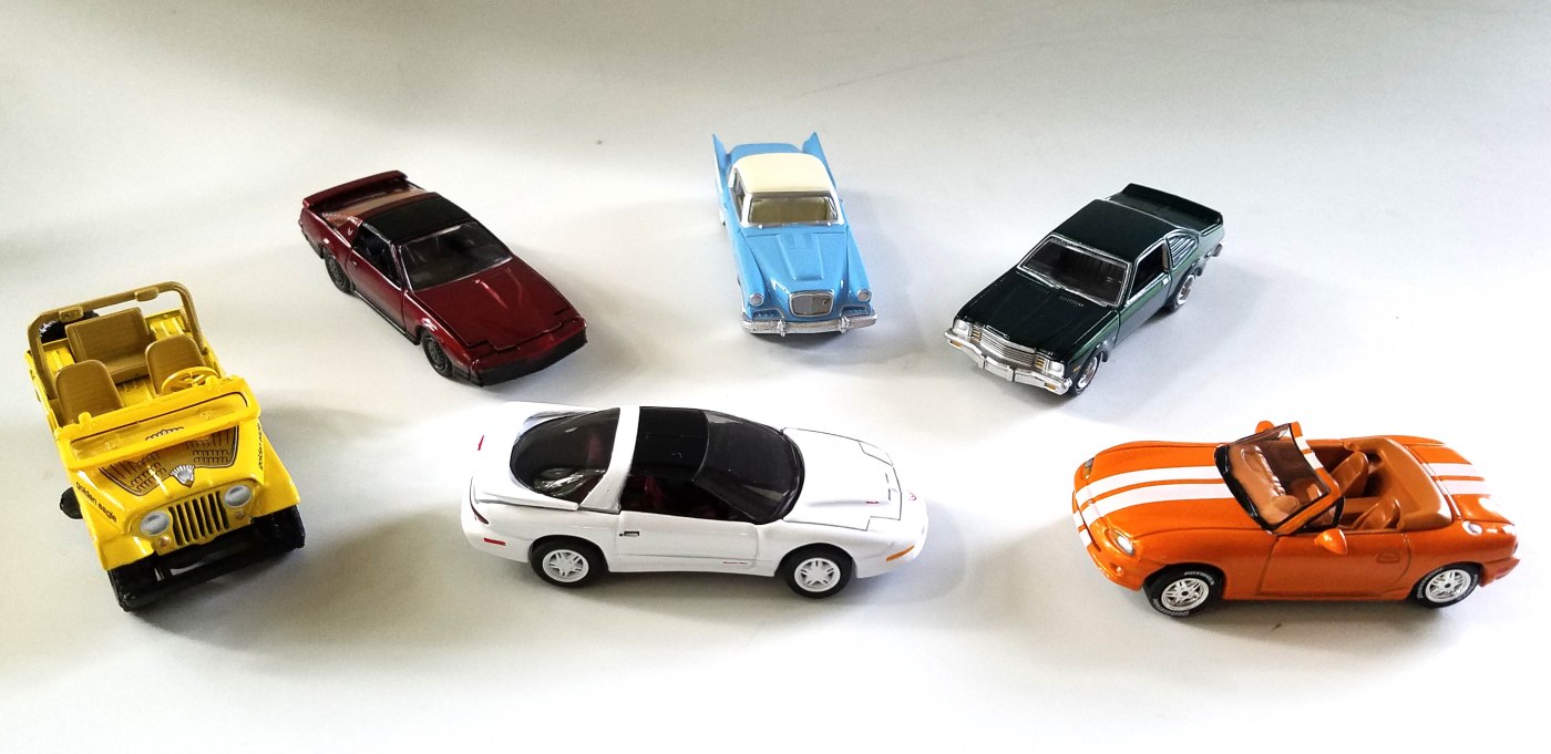 These 6-packs include the same six vehicles, but decked out in different color schemes. This batch features a 1957 Studebaker Golden Hawk, a 1984 Pontiac Firebird T/A, a new casting of the 1996 Firebird T/A WS6, a Jeep CJ-5, a 1999 Mazda MX-5 Miata and a1976 Dodge Aspen R/T. Of the two releases I prefer the B version’s color schemes, not that the others are bad, so I’ll focus on those. But there are pictures of all versions here.