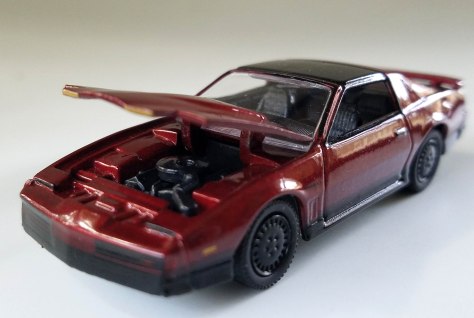 If you’re a Firebird fan this 6-pack doubles your pleasure with a 1984 Firebird T/A. Yes, we all knew that was for Trans-Am, but T&A meant something else to us in 1984. This one is Autumn Maple Firemist, a dark metallic goldish red that looks great with the black roof and interior. There’s black lower body trim and black wheels to spiff it up too, plus the hood opens to reveal the all black engine compartment with air cleaner and radiator. The package notes that this Firebird was GM’s most aerodynamic car ever made, at the time.