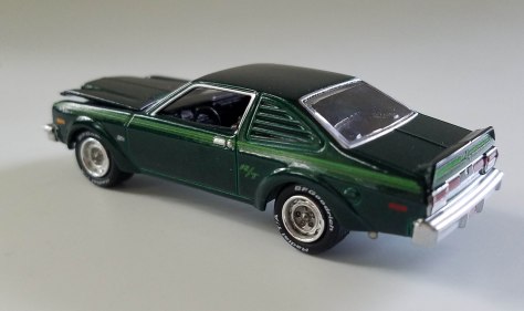 The Deep Sherwood Sunfire (dark metallic green) Aspen is nicely detailed with an opening hood and bright blue engine and black detailing under that hood. Windows are finely outlined in silver paint with wipers molded into the windshield’s base. There are the correct air vents at the hood’s rear and good looking nose and taillight detail, plus the stylish center trunk crease. A side stripe is light green.