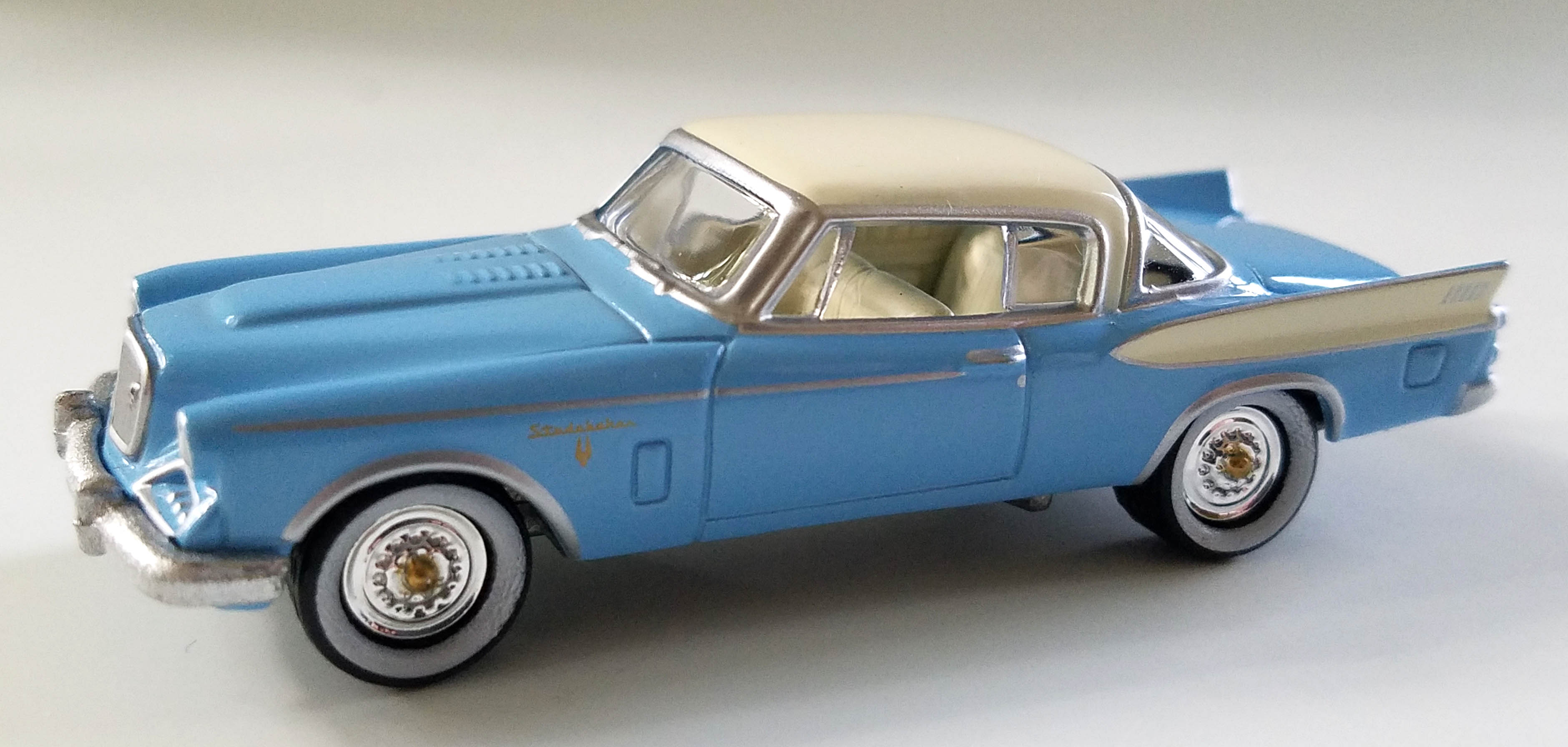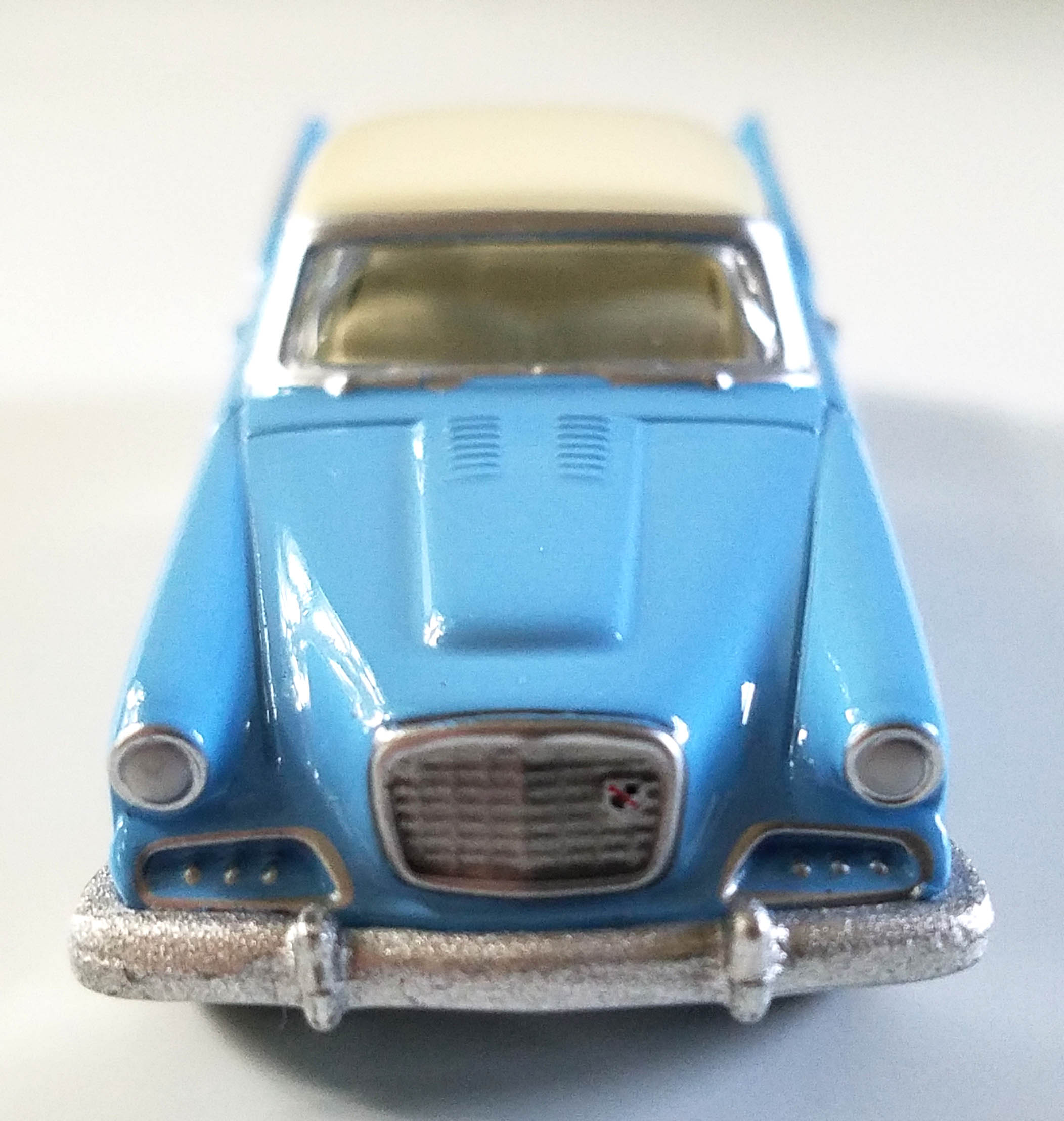 The color is light Wedgewood Blue with a creamy white roof and white interior complete with a sharply cast rear window shelf and speaker. Window trim is silver as are the bumpers and grille, naturally. Tires are white sidewall and treaded with bright chrome wheels. The color here screams 1950s to me.