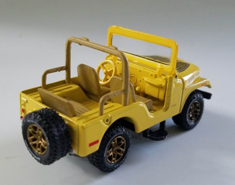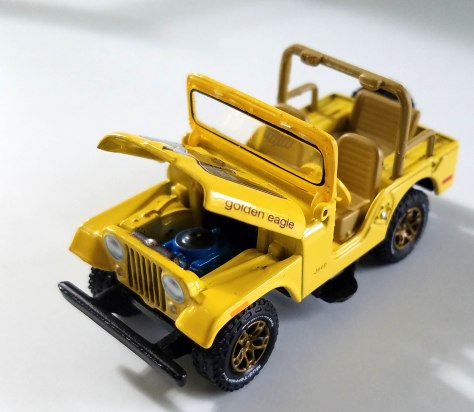 I’ve become more and more of a Jeep fan through the years and JL’s Jeep CJ-5 version is spectacular, again, for the scale. First, it’s decked out in Sunshine Yellow and is the Golden Eagle version with a giant eagle on the hood and the name Golden Eagle on the sides of the hood. Pry up the hood and there’s a blue 304ci V8 with black air filter under the hood. Plus the windshield folds up and down and contains an acrylic windscreen, plus wipers cast into the window frame.