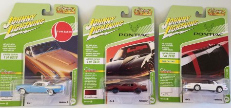 The Firebirds in Version A are Silver Sand Gray for the ’84 model and Medium Cloisonne Poly (medium metallic blue) for the all-new 1996 casting. JL notes the new Firebird casting is exactly 1:64 scale, so could fit into its Auto World True 1:64 series too I suppose.