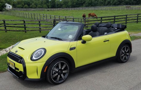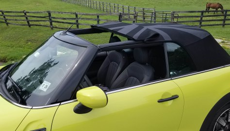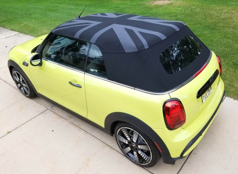 Hits: Fun looks, good power, great handling, power convertible top with sunroof feature, 6-speed manual, plus sharp wheels. Supportive seats with bottom cushion extender, heated seats, big info screen, cool blacked out Union Jack roof.