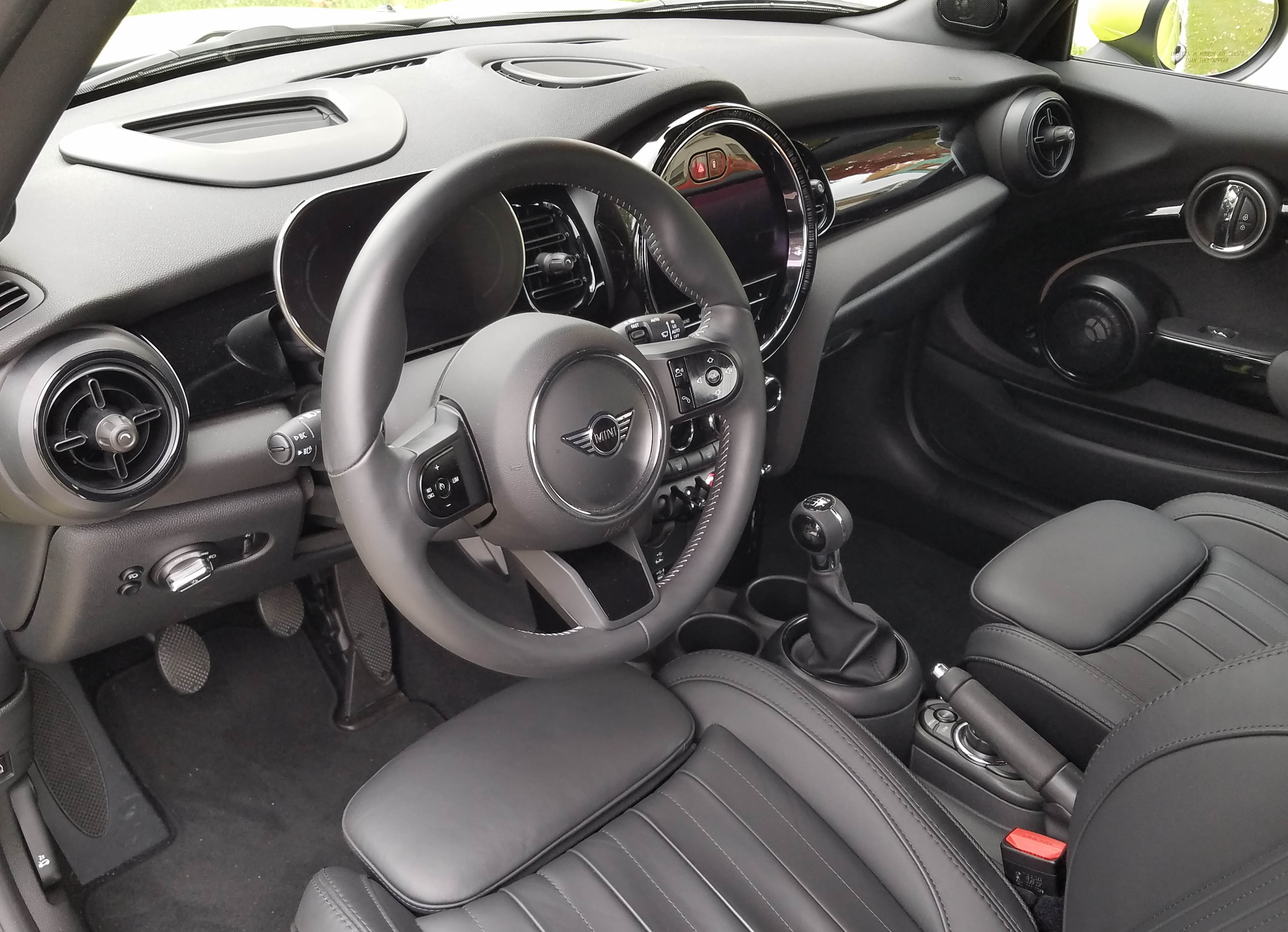 MINI weighs just a smidge over 3,000 pounds so the S version’s twin-turbo 2.0-liter I4 gives it plenty of oomph with 189 horsepower and a torque rating of 207. Car and Driver reports a 6.2-second run-up from zero to 60 mph. That’s achieved by using a toggle low on the center stack to choose Sport over the Mid or Green power levels. Sport is the fun one and gives the MINI an instant burst of power once you tromp the pedal. Mid is fine for city driving and Green is primarily for show, but aims at gas sipping.