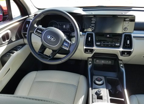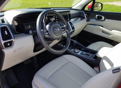 Acceleration is good, maybe a bit more accelerator effort in the hybrid, but even with a 6-speed automatic in place of the 8-speed dual-clutch with the ICE version, shifts are smooth. Plus the electric often powers Sorento up to 20+ mph so it’s quiet. (There’s a mild beep outside to warn pedestrians when you back up.) The ICE and electric power switchovers are seamless.