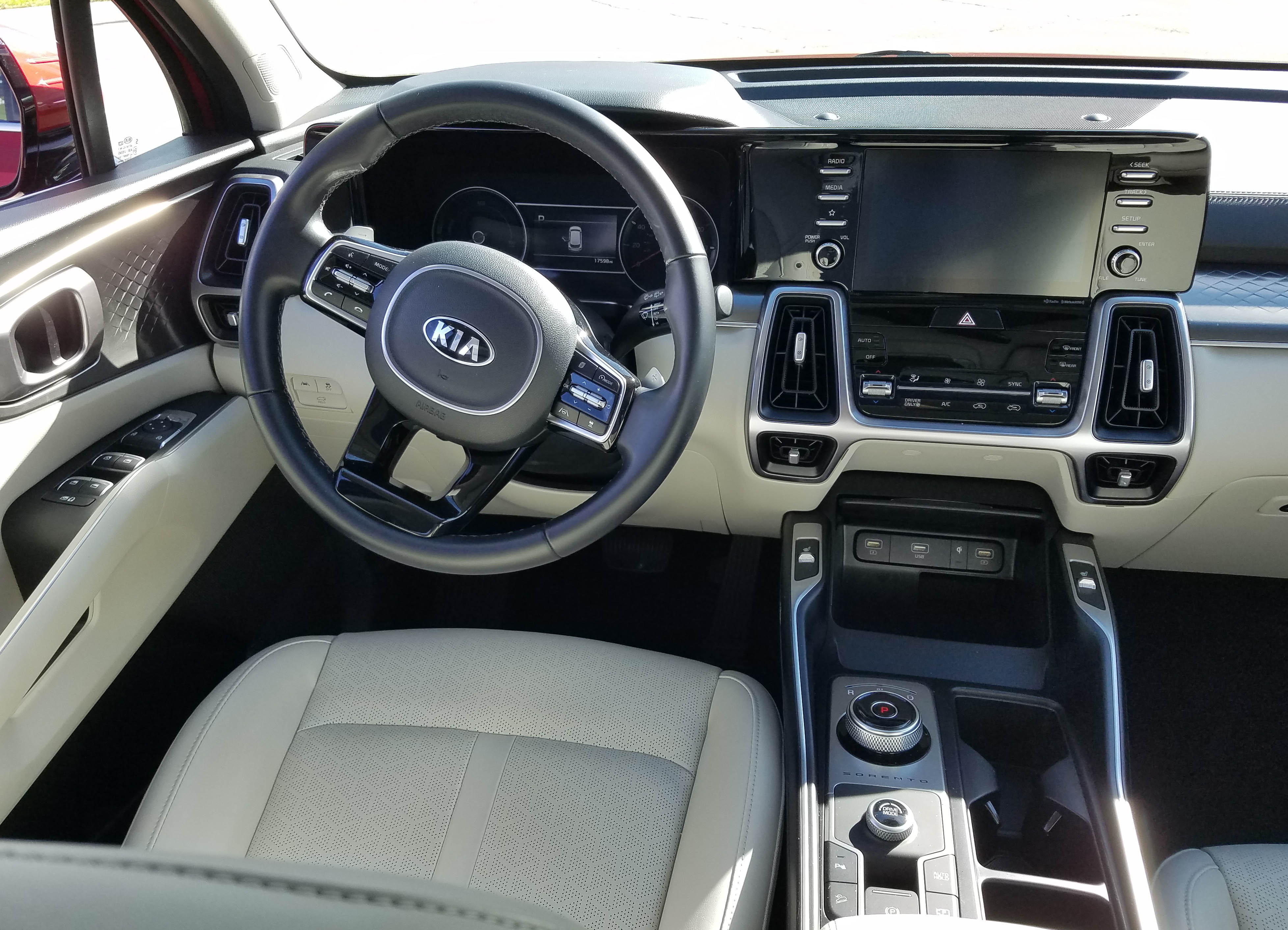 Sorento packs plenty of safety systems. Standard are adaptive cruise control, blind-spot warning, forward collision avoidance and assist with cycle recognition, rear cross-traffic avoidance, lane-keeping, safe-exit assist, and parking sensors. Better yet, the lane-keeping can be turned off to avoid odd steering patterns in town when there’s construction and debris to dodge.