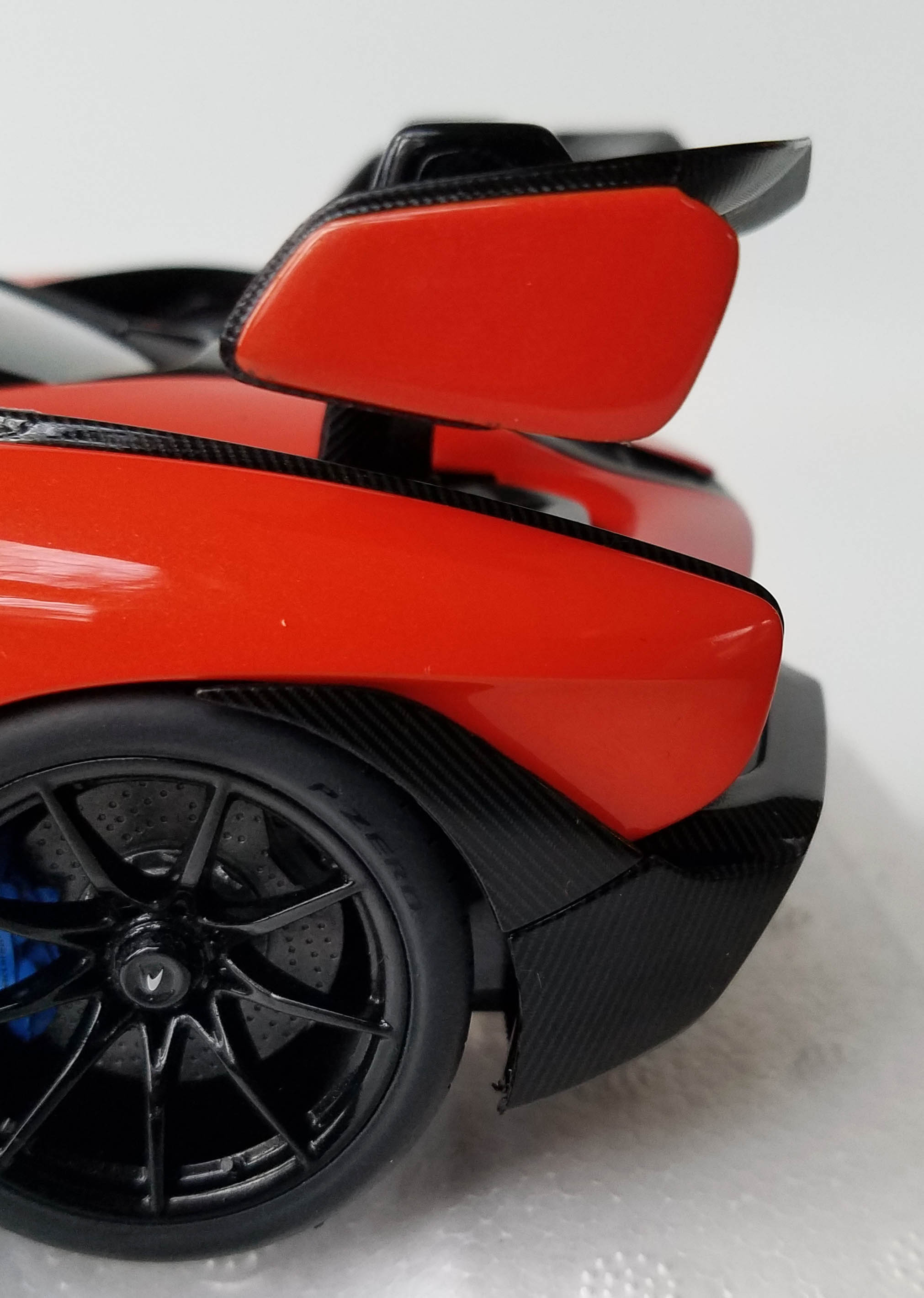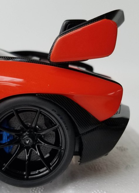 Autoart on the other hand has created five color variations of the Senna — blue, gray, black, white, and this glorious nearly glow-in-the-dark metallic orange. Seeing as how McLaren’s early racers were all a bright papaya orange, this seems the most appropriate color and with its black cockpit area, rear wing, chin spoiler, ground effects trim and rear diffuser, plus gloss black wheels the overall visual can leave one gobsmacked.