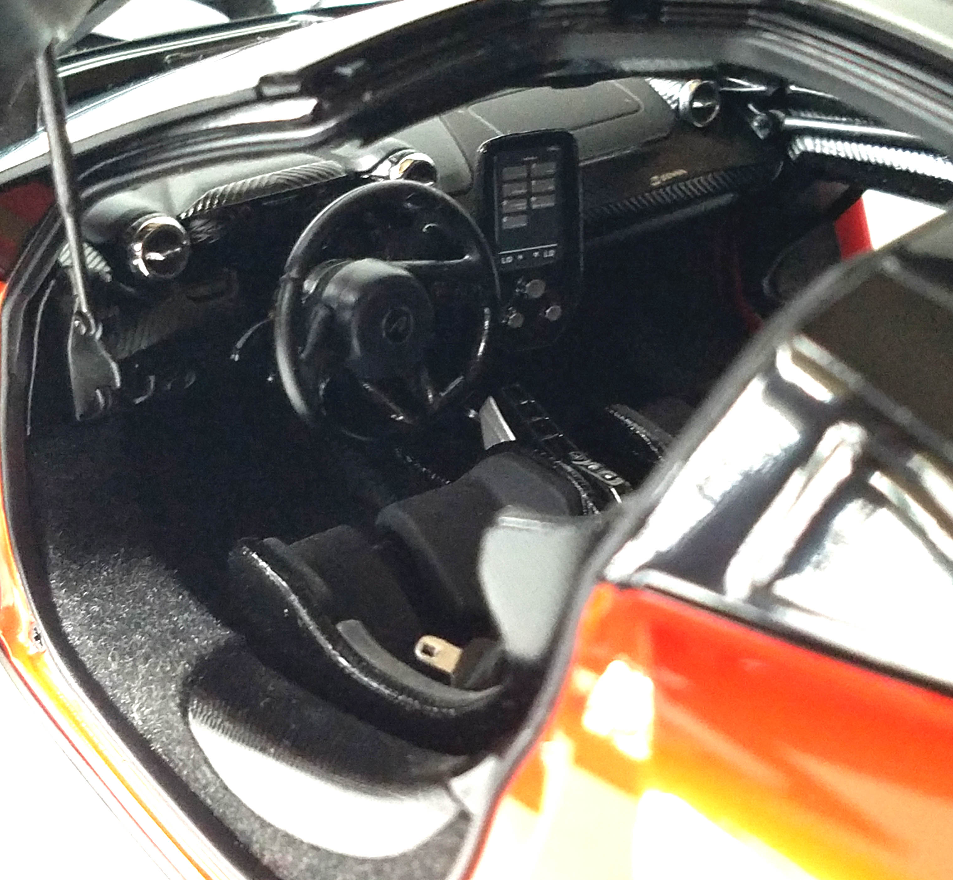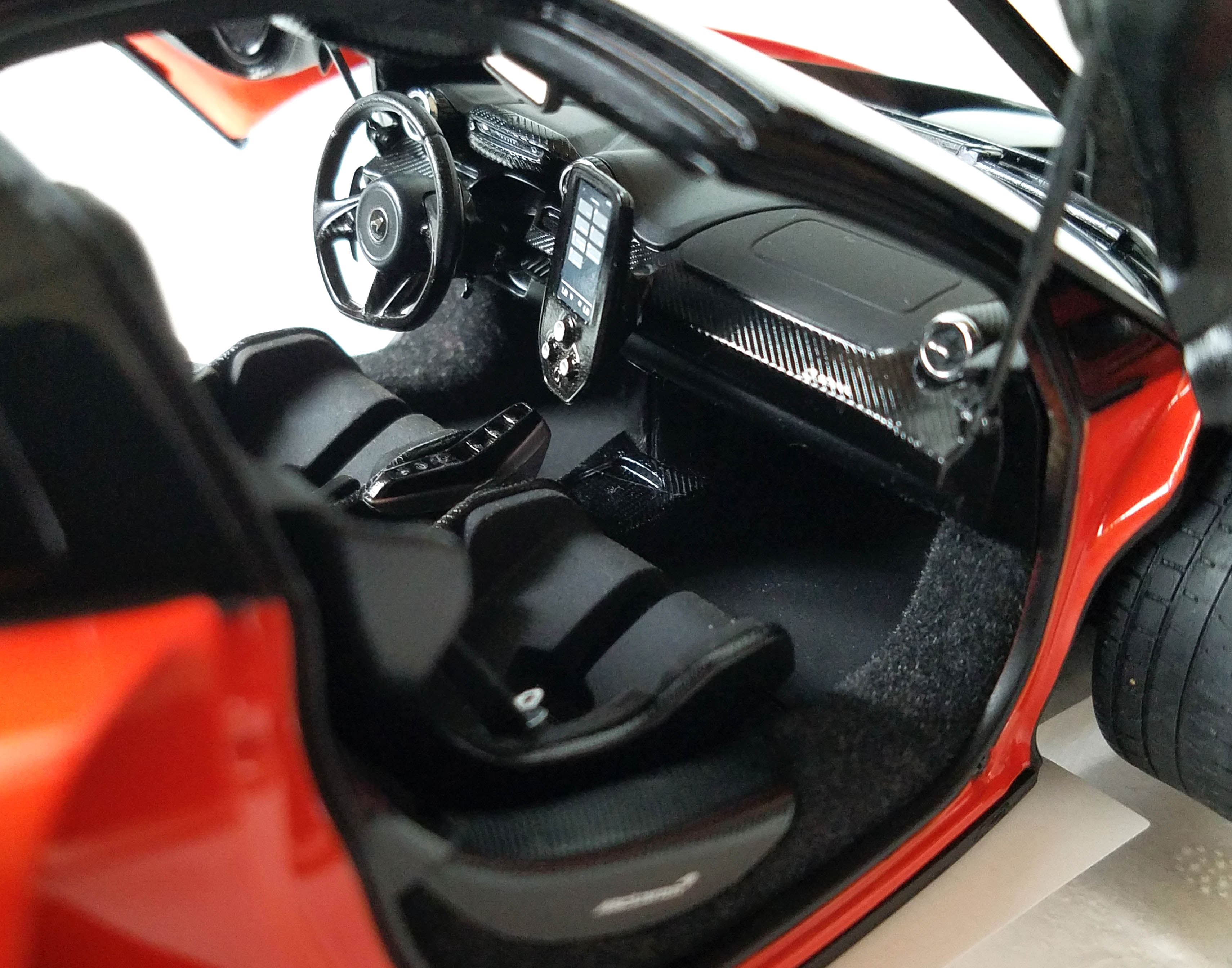 Autoart nails the dash detail too with carbon fiber touches, chrome air vents, a flat-bottom three-spoke race steering wheel and a big vertical screen aimed at the driver for ease of use. The model features black cloth seatbelts with metal clasps to further aid realism and yes, there’s a Senna logo on the passenger-side dash.