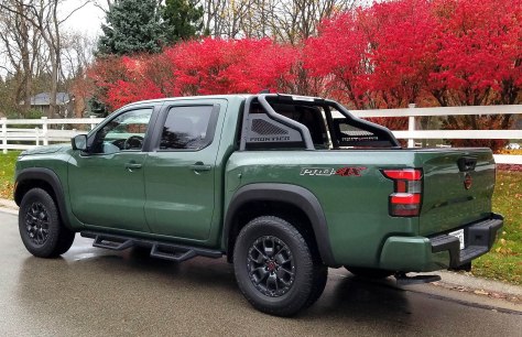 Unlike last week’s smaller, stylish and refined Hyundai Santa Cruz, a compact crossover/pickup, Nissan went for the muscular manly styling that has dominated the market since the 1960s. It works, but isn’t so tall as to make a feller jump up into its cab like mounting a horse in one leap. Oh, this one added the fine off-road style step rails ($750), but they were hardly needed. No, the tested Frontier Pro-4X Crew Cab, designed for off-road loving pickup owners, sits low enough to make daily access easy.