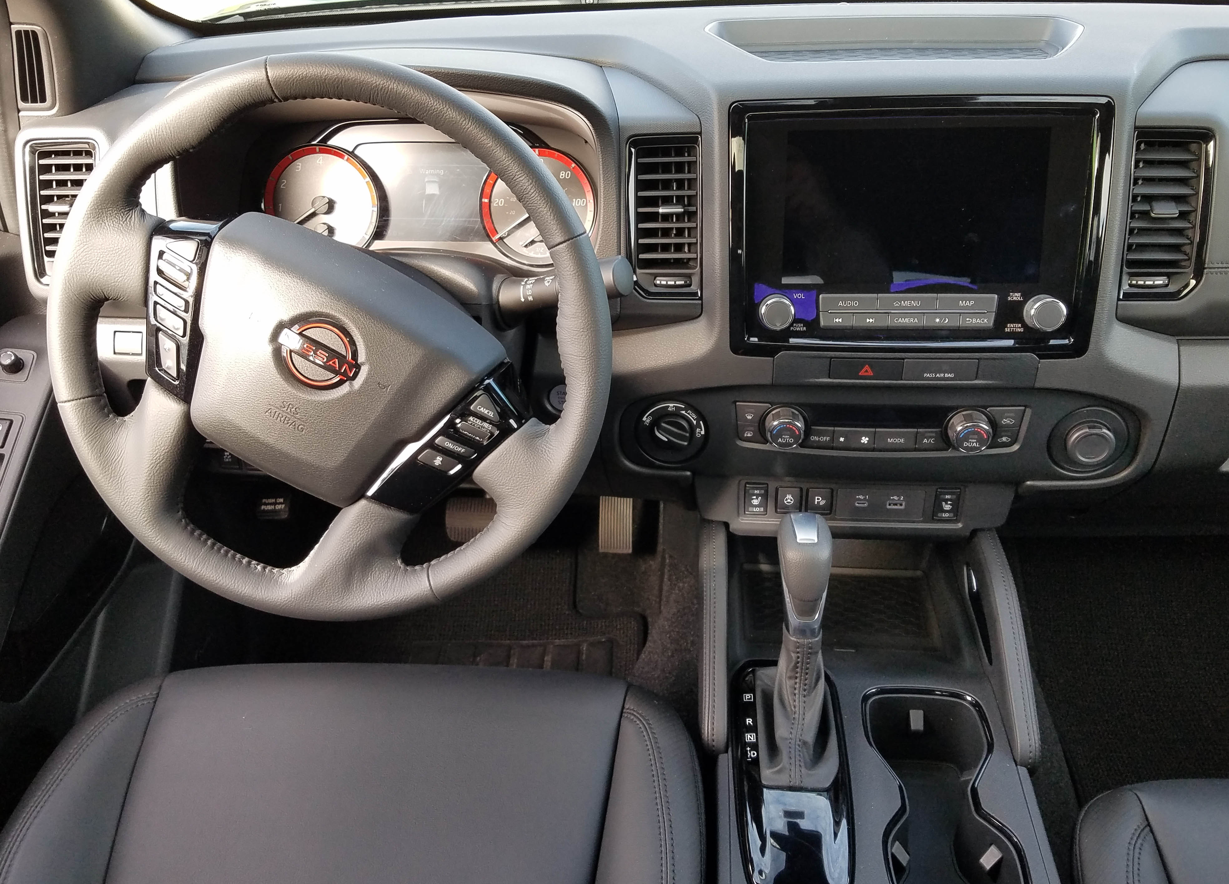 Frontier’s interior looks trucky, meaning muscular, black and off-road useful. There’s a knob on the dash to engage the 4-wheel-drive system, a big 9-inch touchscreen, large radio and climate control knobs and the usual steering-wheel hub with cruise and info screen controls.