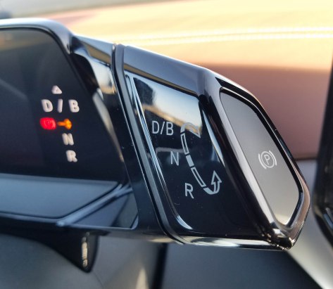 Another item that takes some getting used to, but becomes normal within a week’s drive, is the gear-shift selector, a knob attached to the right side of the instrument pod binnacle or hood. Rotate it forward for Drive and back for Reverse. Park requires pushing the end of the knob. Note too that rotating the knob forward twice shifts drive mode into one that allows more aggressive regenerative braking when the vehicle is coasting. Normally the ID.4 coasts like a standard car, but in this B mode the electric motor braking engages more aggressively to boost battery charge and you’ll find yourself using less brake pedal.