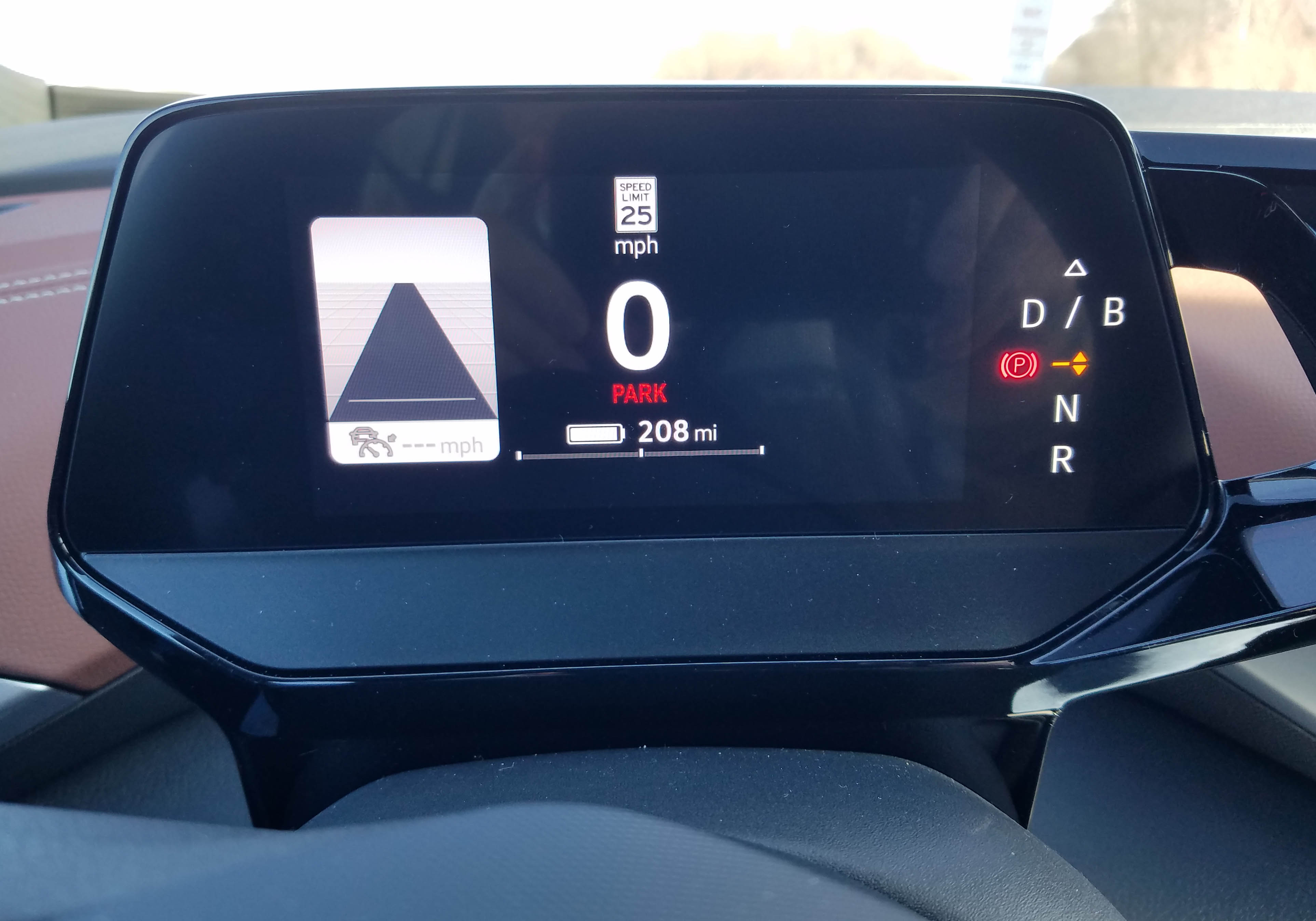 Another item that takes some getting used to, but becomes normal within a week’s drive, is the gear-shift selector, a knob attached to the right side of the instrument pod binnacle or hood. Rotate it forward for Drive and back for Reverse. Park requires pushing the end of the knob. Note too that rotating the knob forward twice shifts drive mode into one that allows more aggressive regenerative braking when the vehicle is coasting. Normally the ID.4 coasts like a standard car, but in this B mode the electric motor braking engages more aggressively to boost battery charge and you’ll find yourself using less brake pedal.
