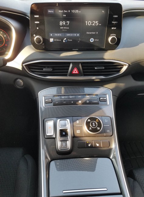 An 8-inch touchscreen is easy to use and the climate controls arranged below are simple to read and use. A 10-inch screen is available in higher-end trims. Santa Fe also features a push-button transmission on the console. That takes some getting used to and I’d prefer a shift lever or knob that one can easily grab without looking at it, something buttons require.