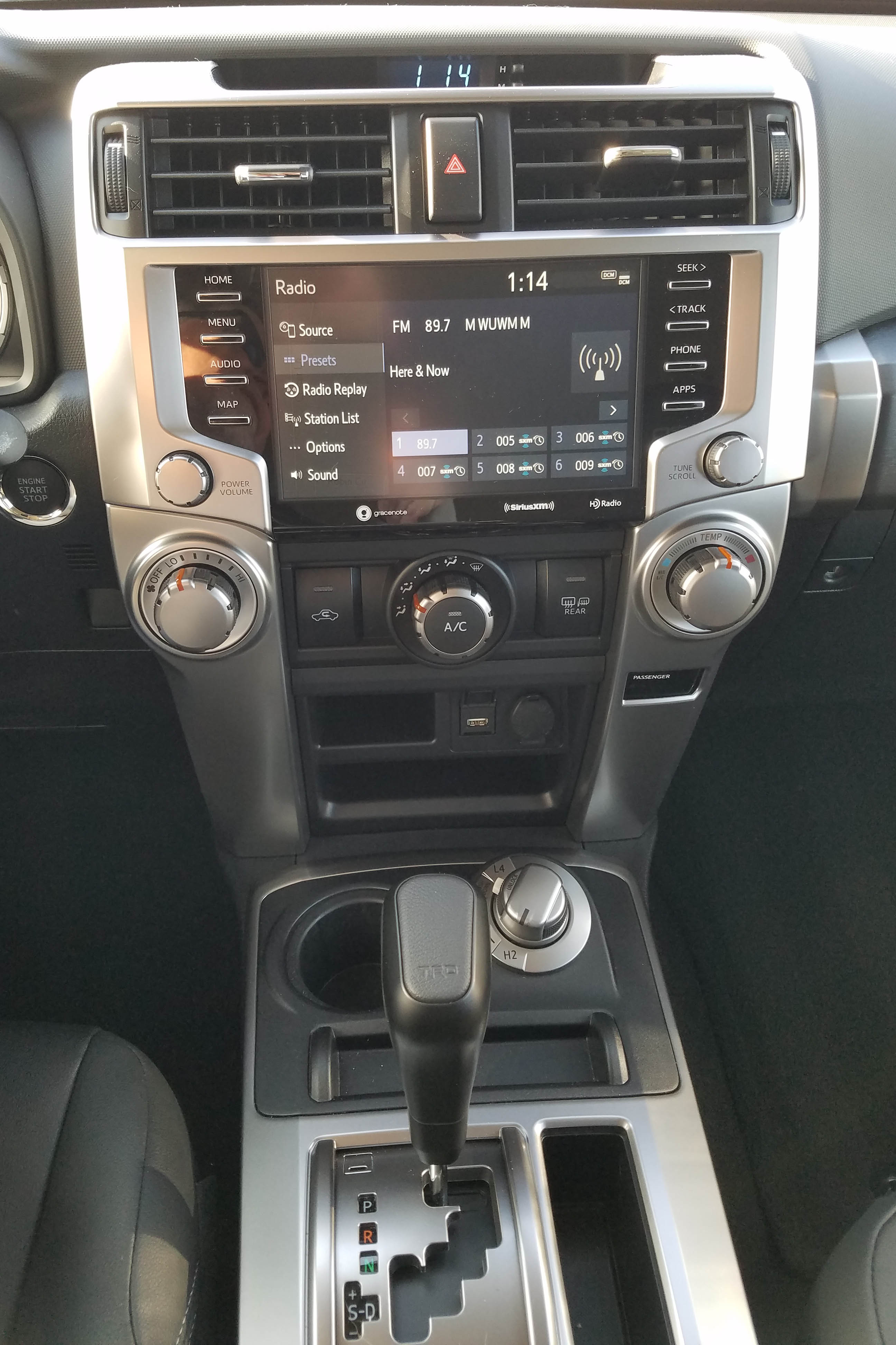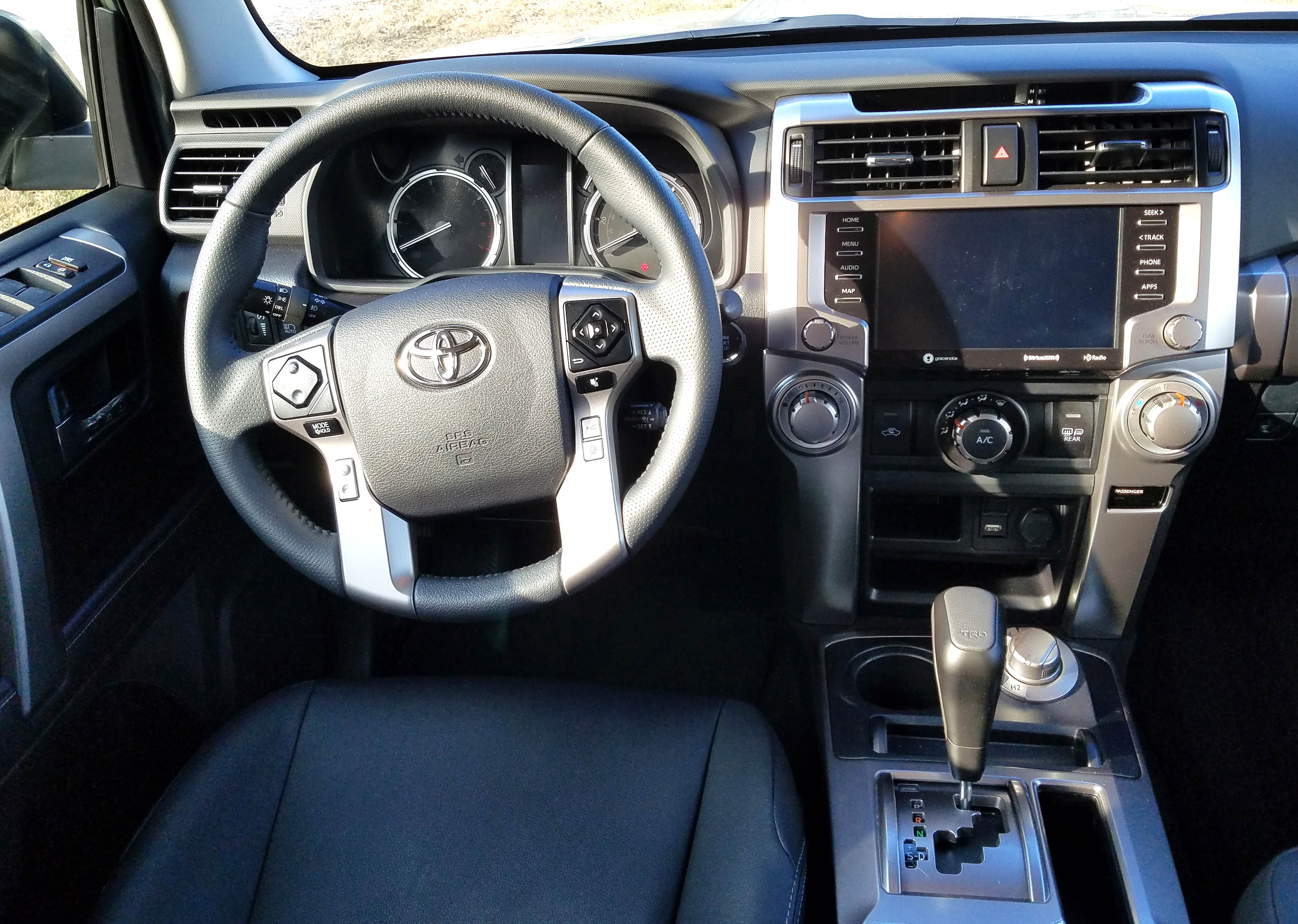 Things like ground clearance, which is 9+ inches here, are vital. So is 4WD and hill descent control. Both come on this TRD Sport and Toyota even ditches the big 4WD shifter lever on the console for a dial for high and low range. The hill descent button and another to adjust for off-road conditions are on the overhead control panel.