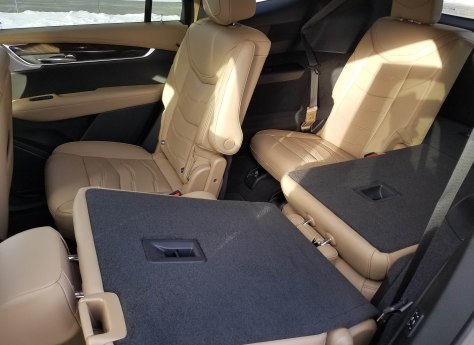 Note too this was a 6-passenger model ($800 extra) with captain’s chairs in the second row. A second row bench is standard and would allow the XT6 to carry seven. Room is generous in the third row, as the second row seats will slide forward. But the floor is raised in row three so knees ride a little higher than in row two. All seats are comfy, both soft due to the leather surfaces, and well-formed for hip support support. Cadillac also provides power buttons inside the power hatch to lower the third row seats, and buttons inside the second row doors to lower third row headrests and seats.