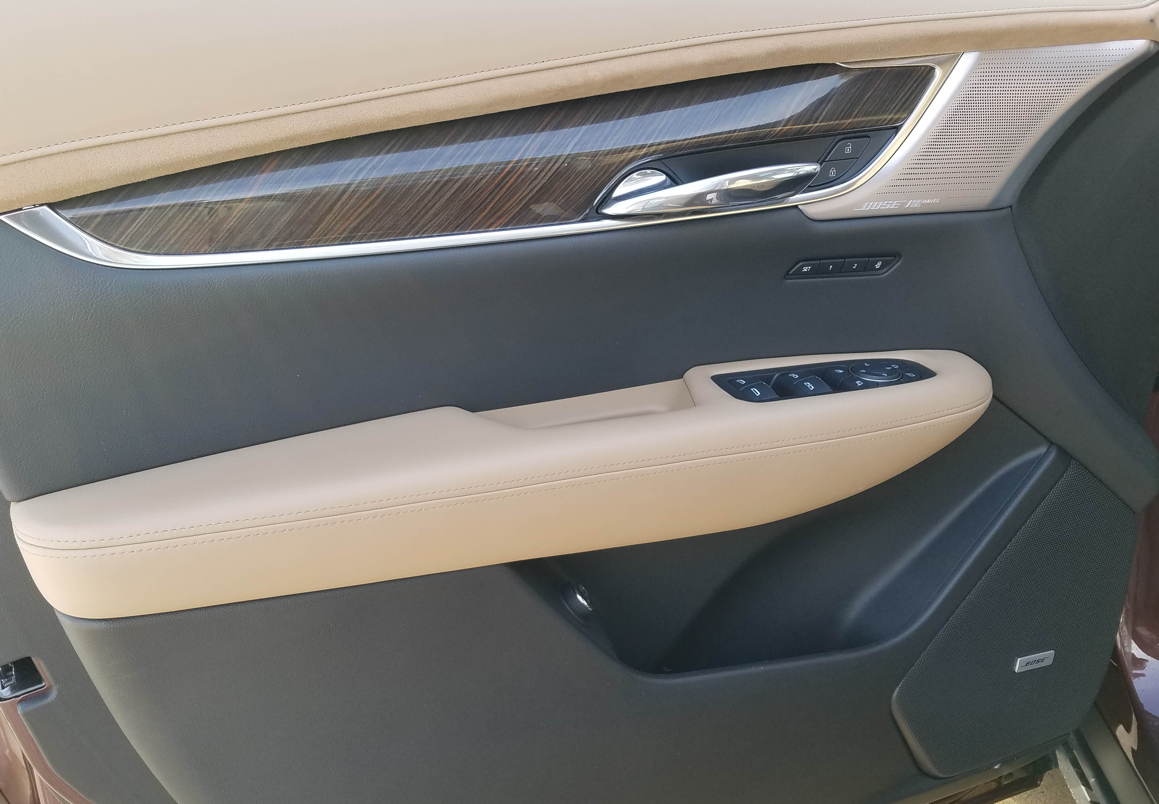 The test ute was a sophisticated Rosewood Metallic, a sparkly red-tinted copper color ($625 extra) that was blessedly not gray, silver, or white, as are nearly all other SUVs on the market. The interior also featured an equally stylish, tasteful two-tone tan and black cockpit with semi-aniline leather seats topped by Cadillac crests atop their back cushions. The dash was tan over black with a glossy fake wood trim, silver Bose door speaker covers, and chrome trim around the dash and doors’ wood.