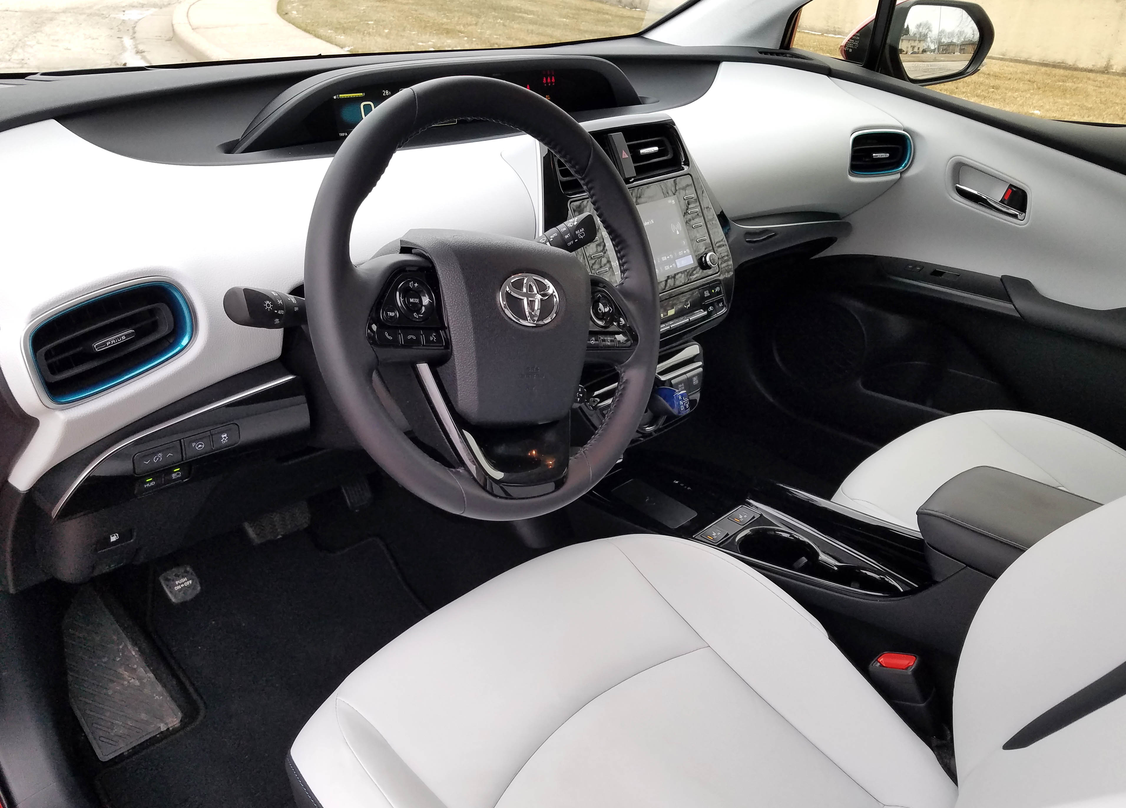 Here the 121-horsepower is modest, of course, but is delivered smoothly via an electronically controlled CVT. At low speeds the electric power is delivered with a slight whine, but the cockpit is extremely quiet. Pressing the accelerator hard for instant power delivers a noticeable moan from that little I4 engine, yet by 40 mph when the Prius is cruising, it quiets right back down.