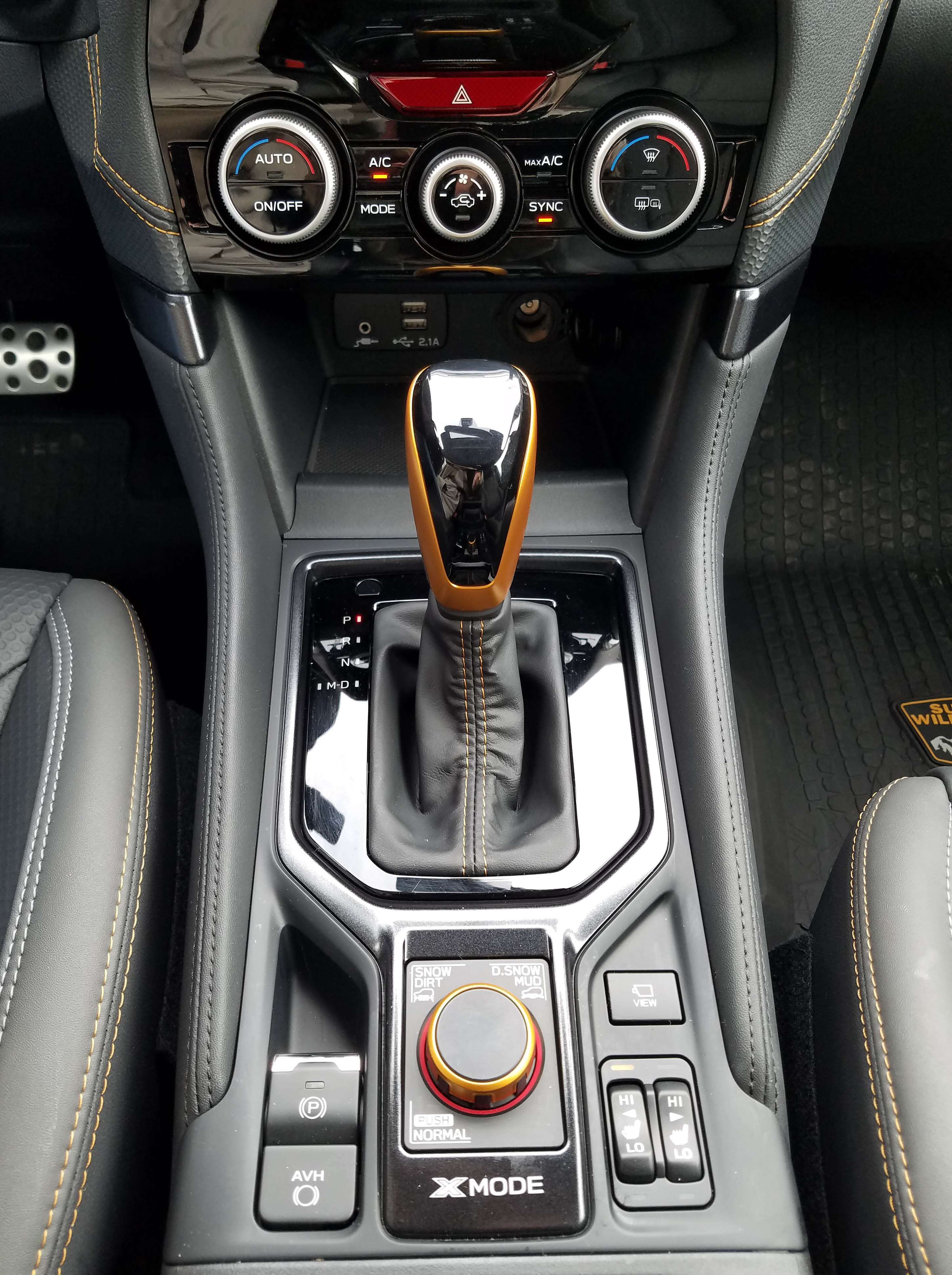 Inside, the steering wheel hub’s lower spoke is copper as is the gear shift knob and X-Mode dial. Subaru also trims its durable StarTex water-resistant seats, along with the dash and doors in copper stitching. Wilderness logos grace the front seat backs too. All cool!