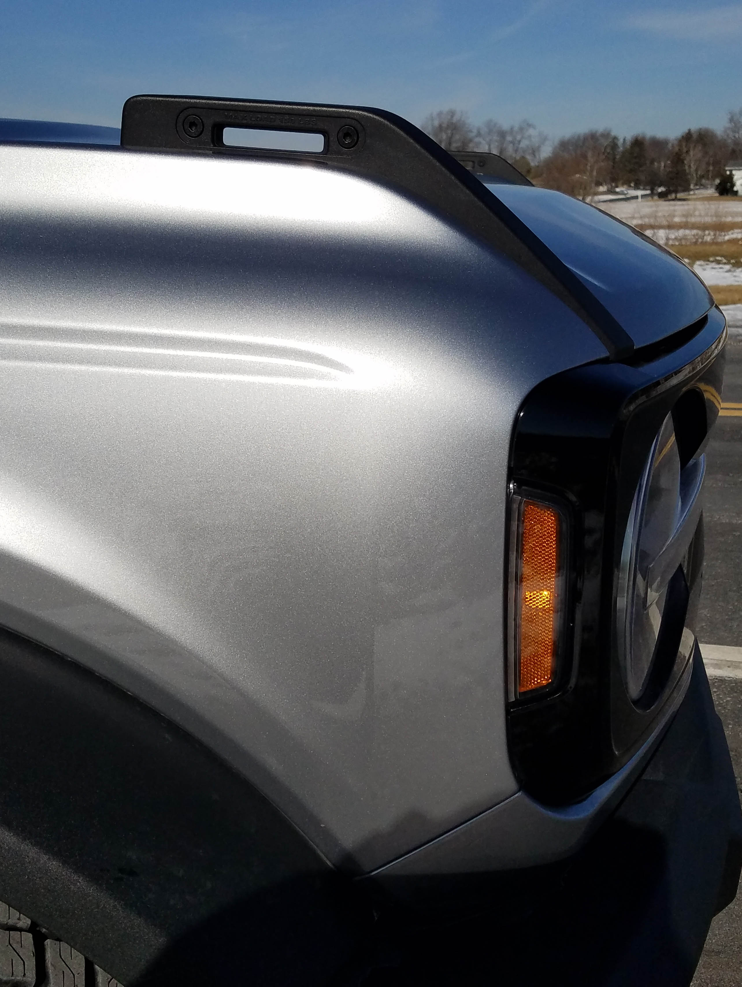 Something the Bronco has that Jeep doesn’t? Trail sights, the black trim atop the front fenders. Look sort of like gun sights, but apparently could help you keep the Bronco aimed properly on a dusty or rocky trail.
