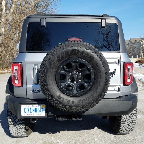 Bronco’s rear hatch is like a Jeep’s as it opens like a door and is split so the window folds up once the tailgate is open. That gate is heavy too as the full-size spare, like a Jeep’s, hangs there.