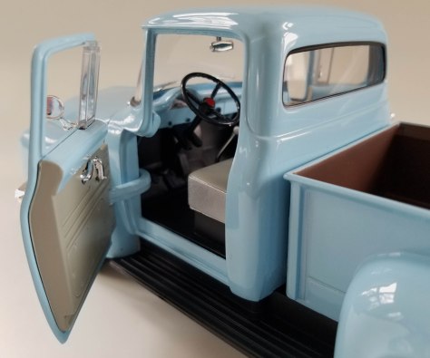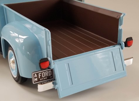 Wipers are chrome trimmed as are the big side mirrors, door handles and round dog dish style hub caps with Ford simply engraves across their center. Wheels are blue to match the truck’s body and there are thin whitewalls for the unbranded, but treaded tires.