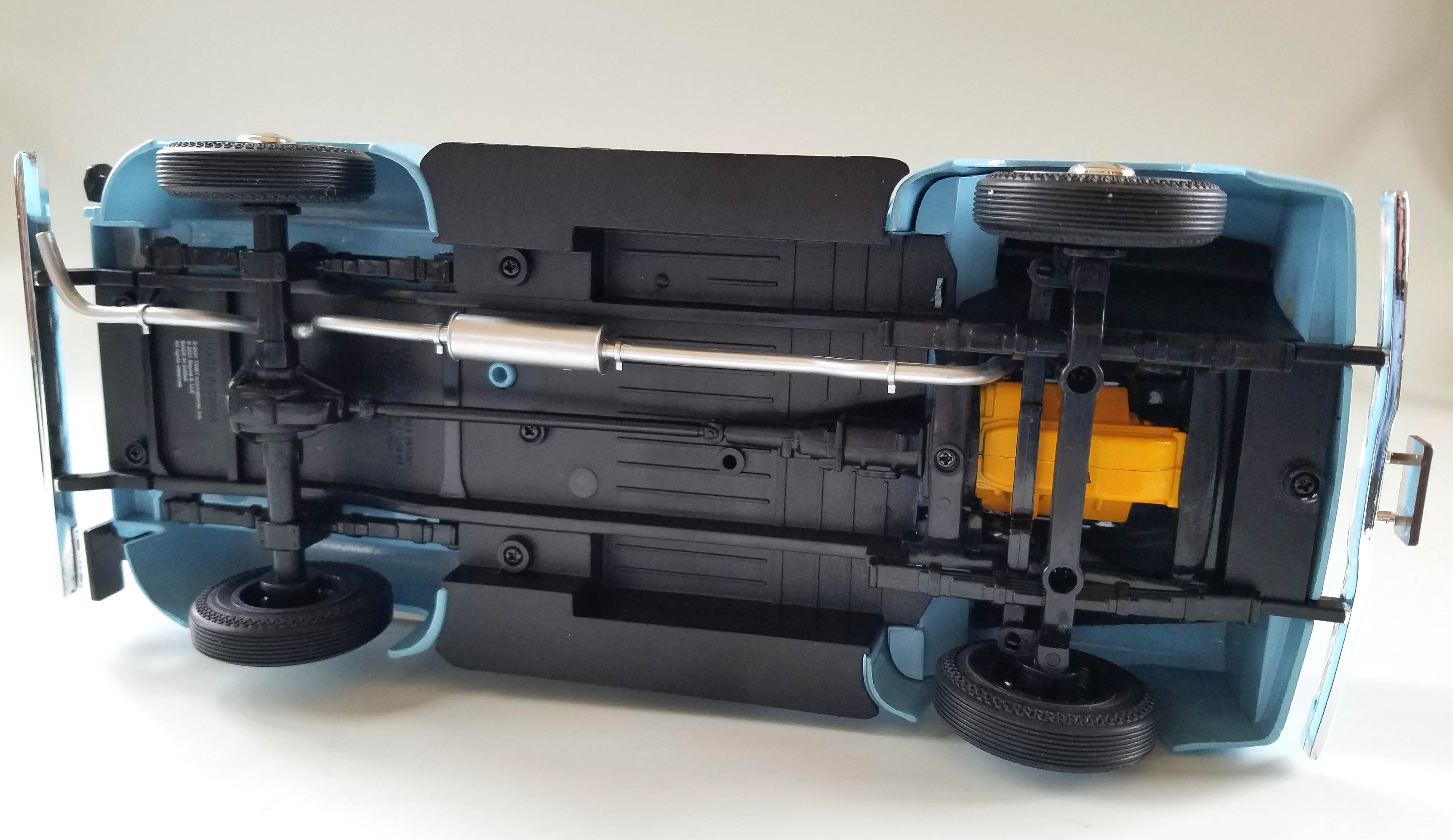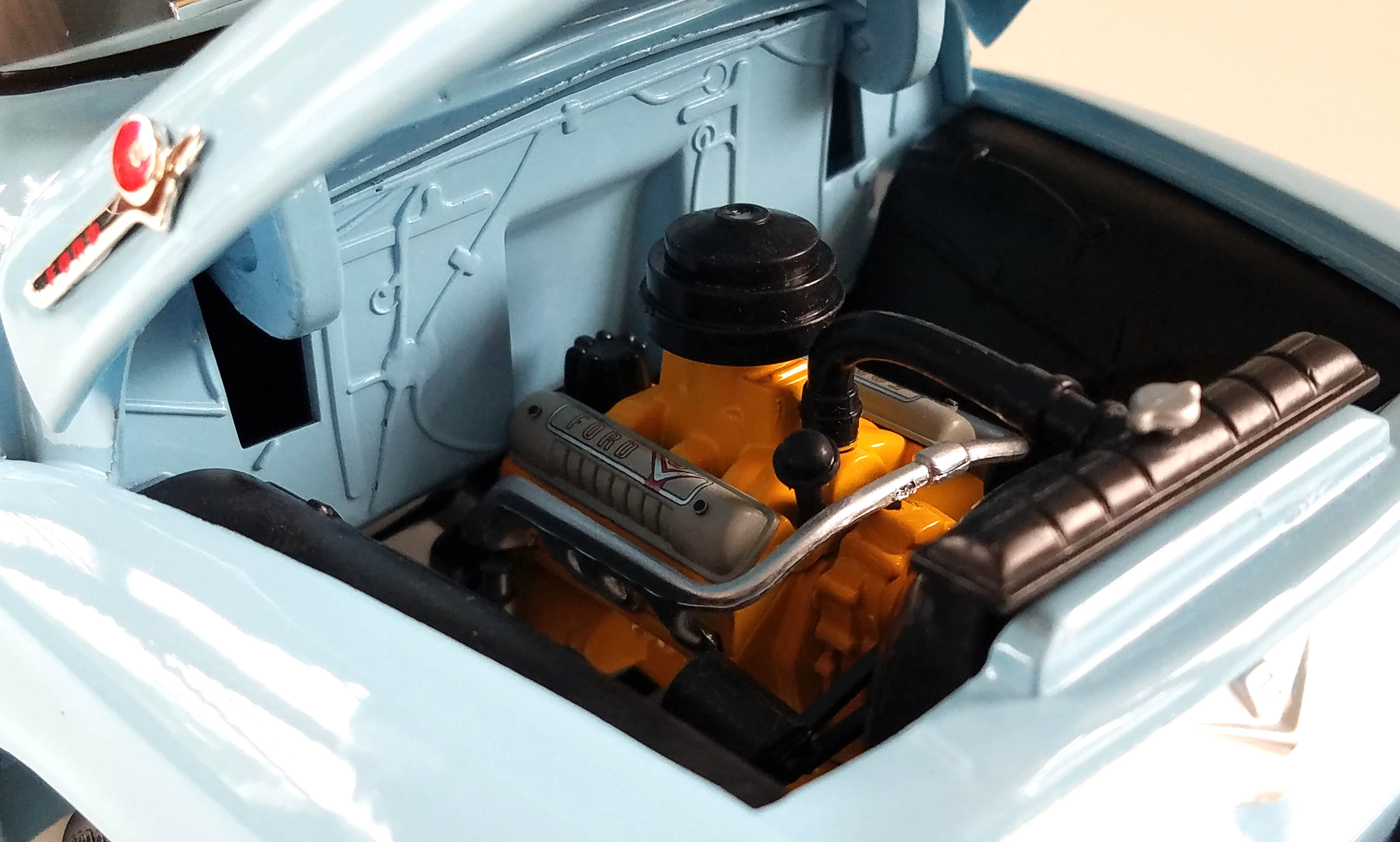 Naturally that big hood will open via large hinges and beneath is the yellowish-orange V8 block with Ford-labeled headers and a round black air filter. There’s a radiator and a few other under-hood bits and pieces, plus molded in firewall and hood features that give this a simple air of realism. Probably could use some oil splattered about or mud under the hood to show it has been used, but maybe that model will be another version from AW.