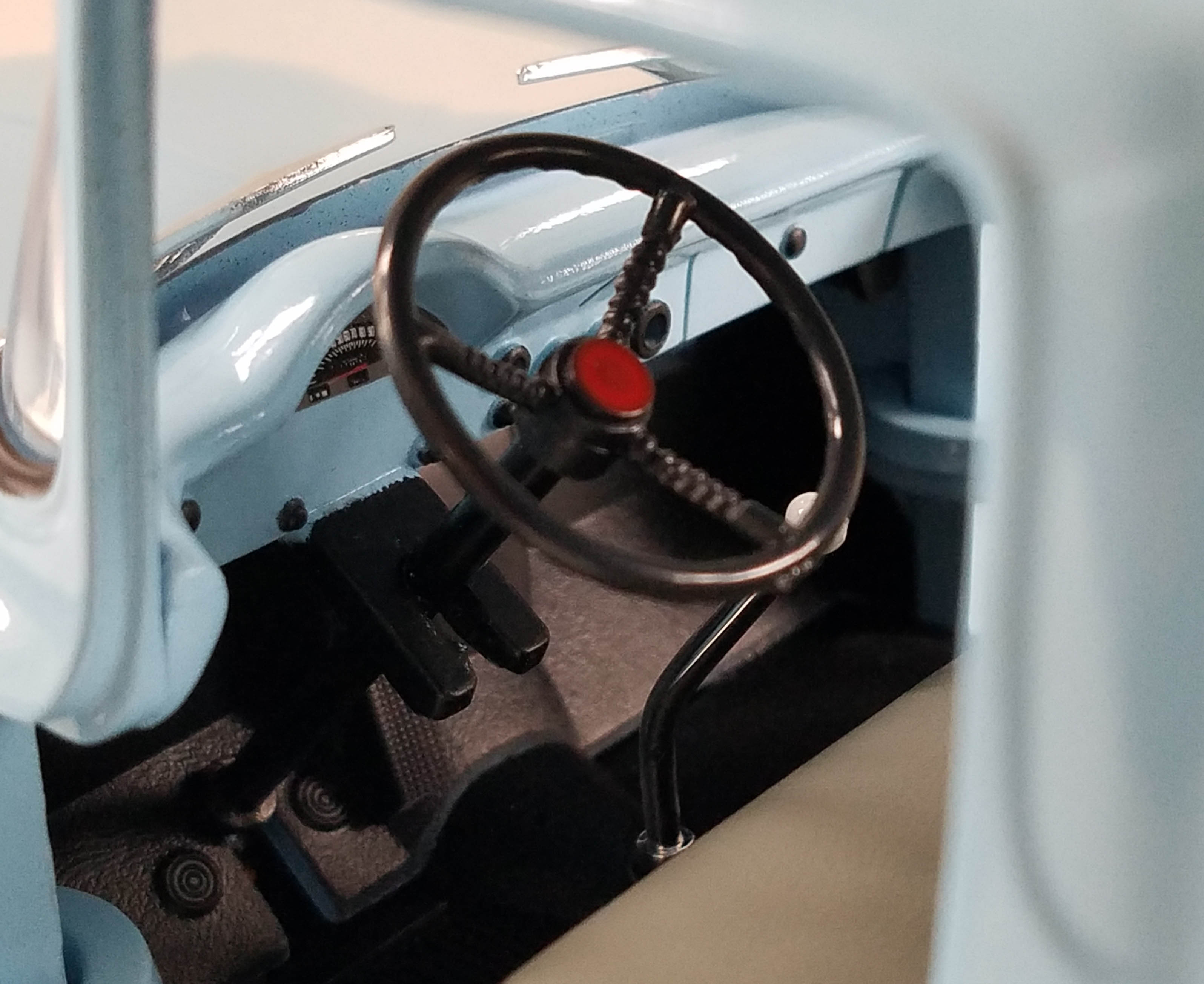 Wipers are chrome trimmed as are the big side mirrors, door handles and round dog dish style hub caps with Ford simply engraves across their center. Wheels are blue to match the truck’s body and there are thin whitewalls for the unbranded, but treaded tires.