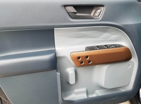 The test truck’s interior was simple but attractive with brown and dark blue faux leather seats. That blue matches the truck’s exterior. I also like the copper trim on the dash, air vents and door armrests, which are abbreviated and quite easy to use in pulling a door shut. The console is wisely a matte blue and brown so no reflections there on sunny days.