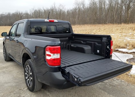 For the record, Maverick’s bed is 4.5 feet deep and the test unit had a spray-in bedliner. The lift-in height is just 30 inches and the tailgate folds down quickly, no easy-drop, or multiple function version here as on fancier pickups. But this is right-sized to haul lumber, bushes and yard waste. Even a couple bikes will fit in back.