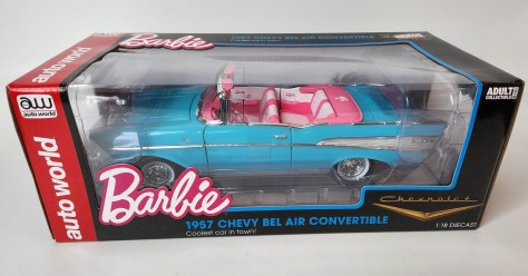Indeed, Barbie has driven a lot of cars from an Austin Healey early on to Ferraris and the ’57 Chevy. All have been various shades of pink, with other bright colors mixed in. But mostly Barbie is seems a girly girl, so pink drives her world.