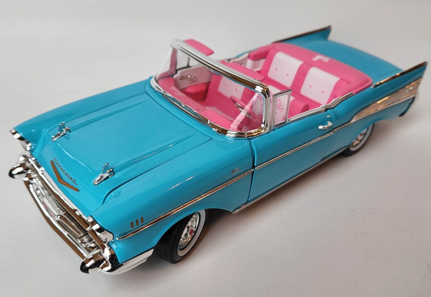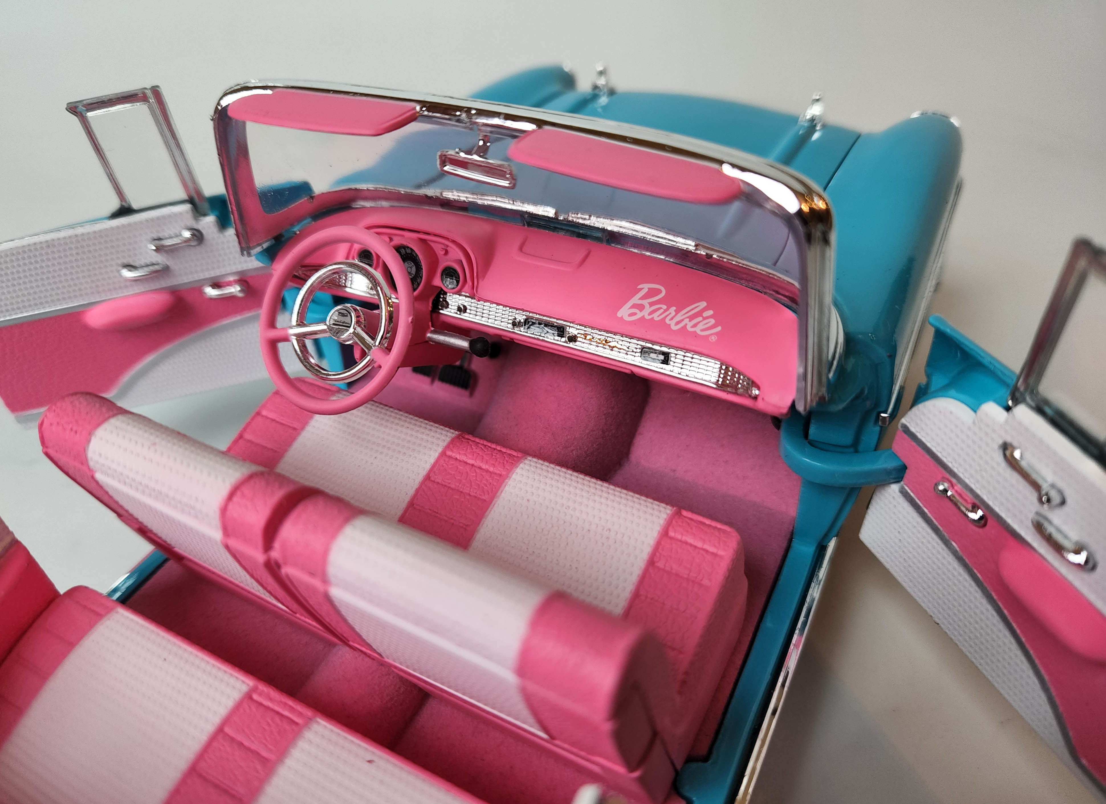 Turquoise and pink certainly team up to shout 1950s car fashion, but in this case they also scream Barbie dream car.