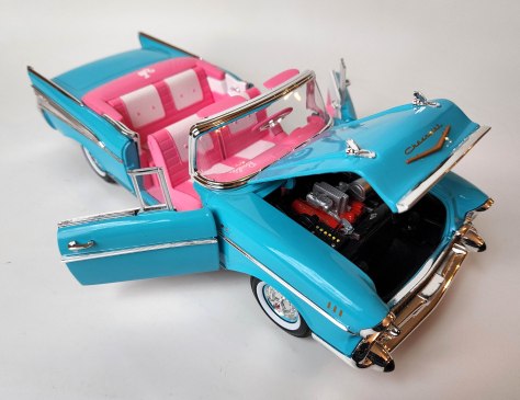 Well, that classic was plastic, and not very detailed. Now comes an eye-popping die-cast metal version from Auto World, which makes dozens of 1950s-1970s muscle cars and other vintage automotive icons. The same quality and attention to detail as in its other cars and trucks is present in this Barbie special, being marketed under its Silver Screen Machines category as the “Coolest car in town!”