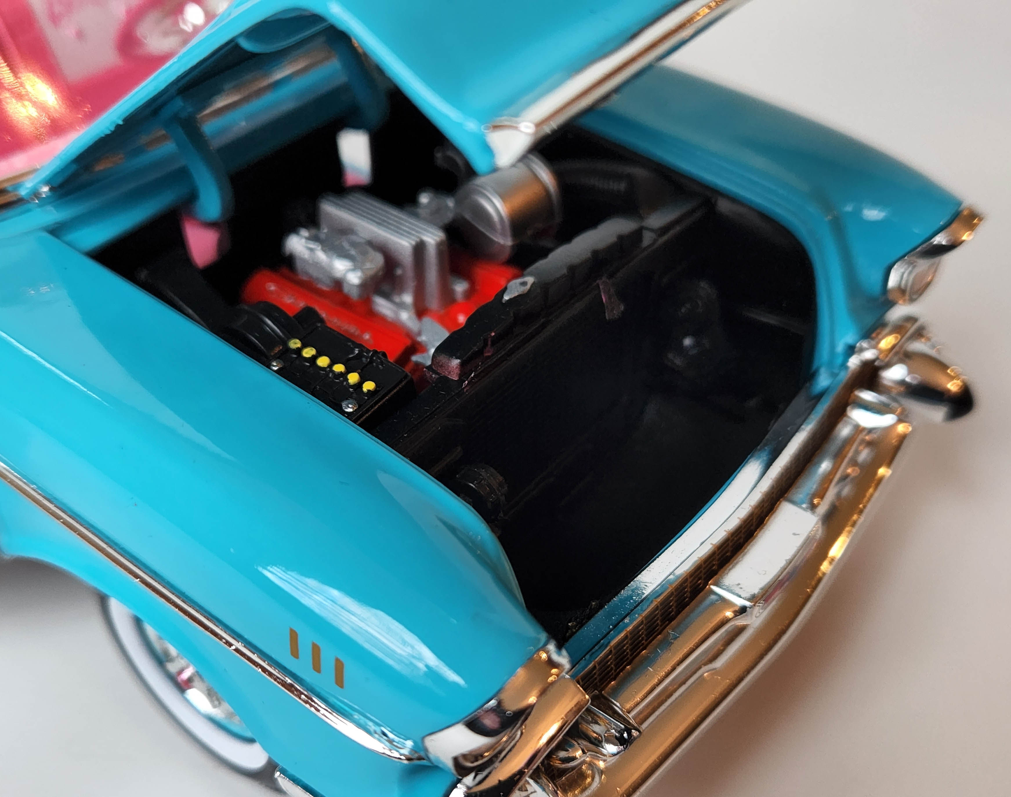 Under the hood is the Chevy red engine block with silver air filter and fuel injection system, a black battery and radiator with black horn on the front left. Big hood hinges allow the hood to be easily posed in the up position.