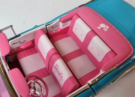The Barbie car’s interior is what you’ll likely notice first, and if you’re a Barbie fan and collector this is what will light your fuse. The seats are bright pink with white (or is that pale pink) inserts with Barbie in cursive on the driver’s seat back. The pink tonneau includes a white silhouette of a pony-tailed young woman at its center and tiny painted silver snap heads all about the tonneau’s edge, ostensibly to keep the tonneau in place.