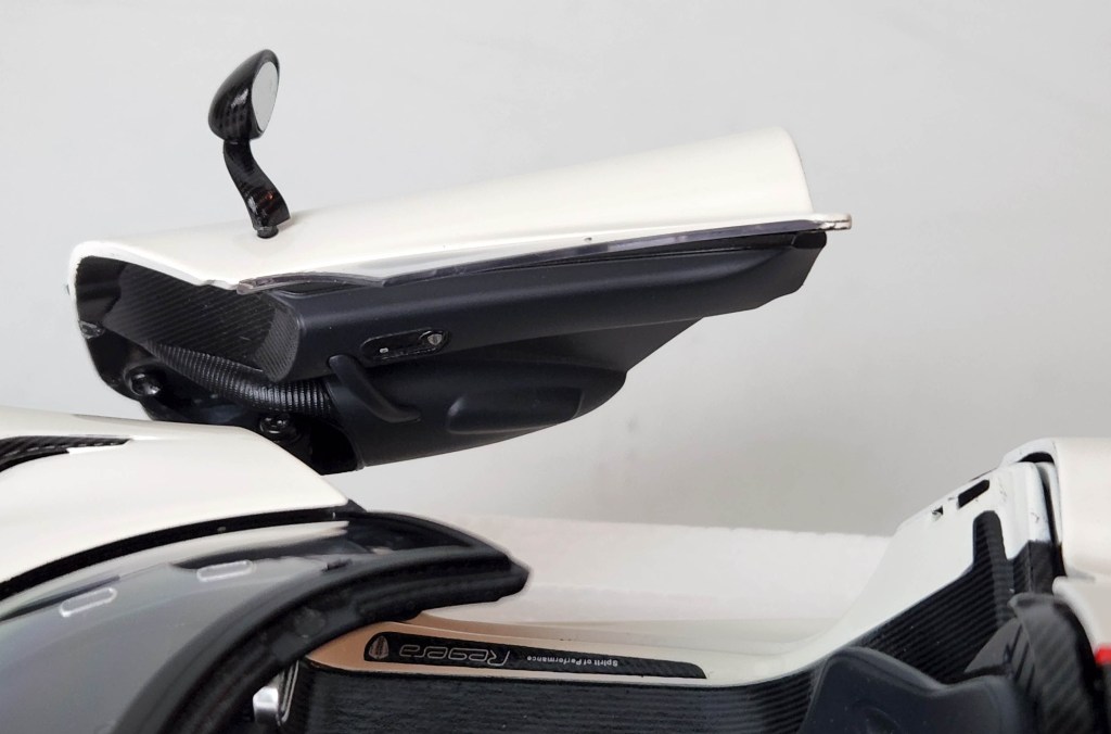 Regera’s doors are fascinating, sliding outward first, then flipping up like scissor doors. Very clever and bravo to Autoart for mastering the mechanics. Side windows are fixed in the doors.