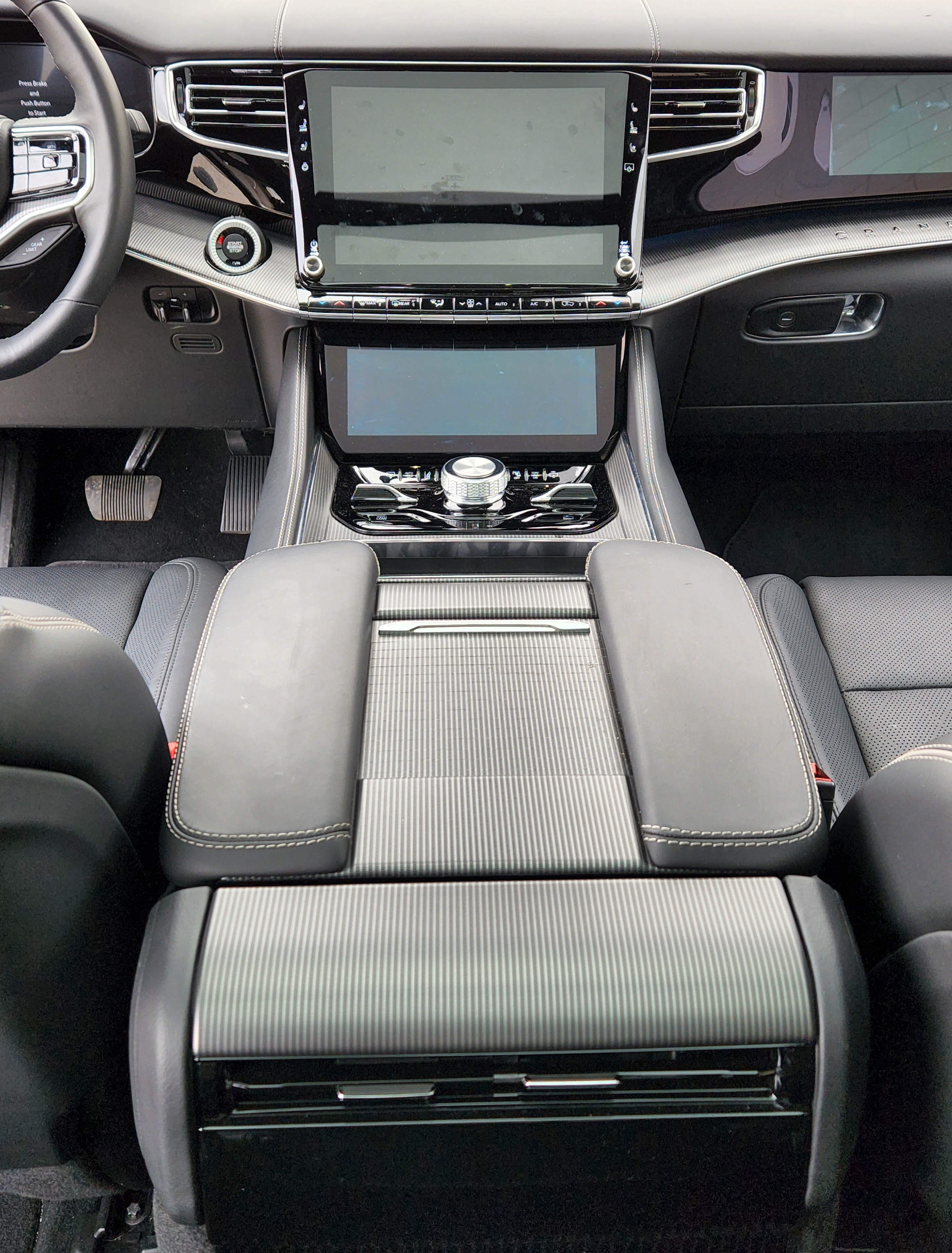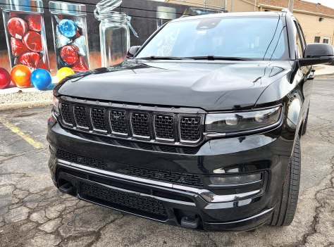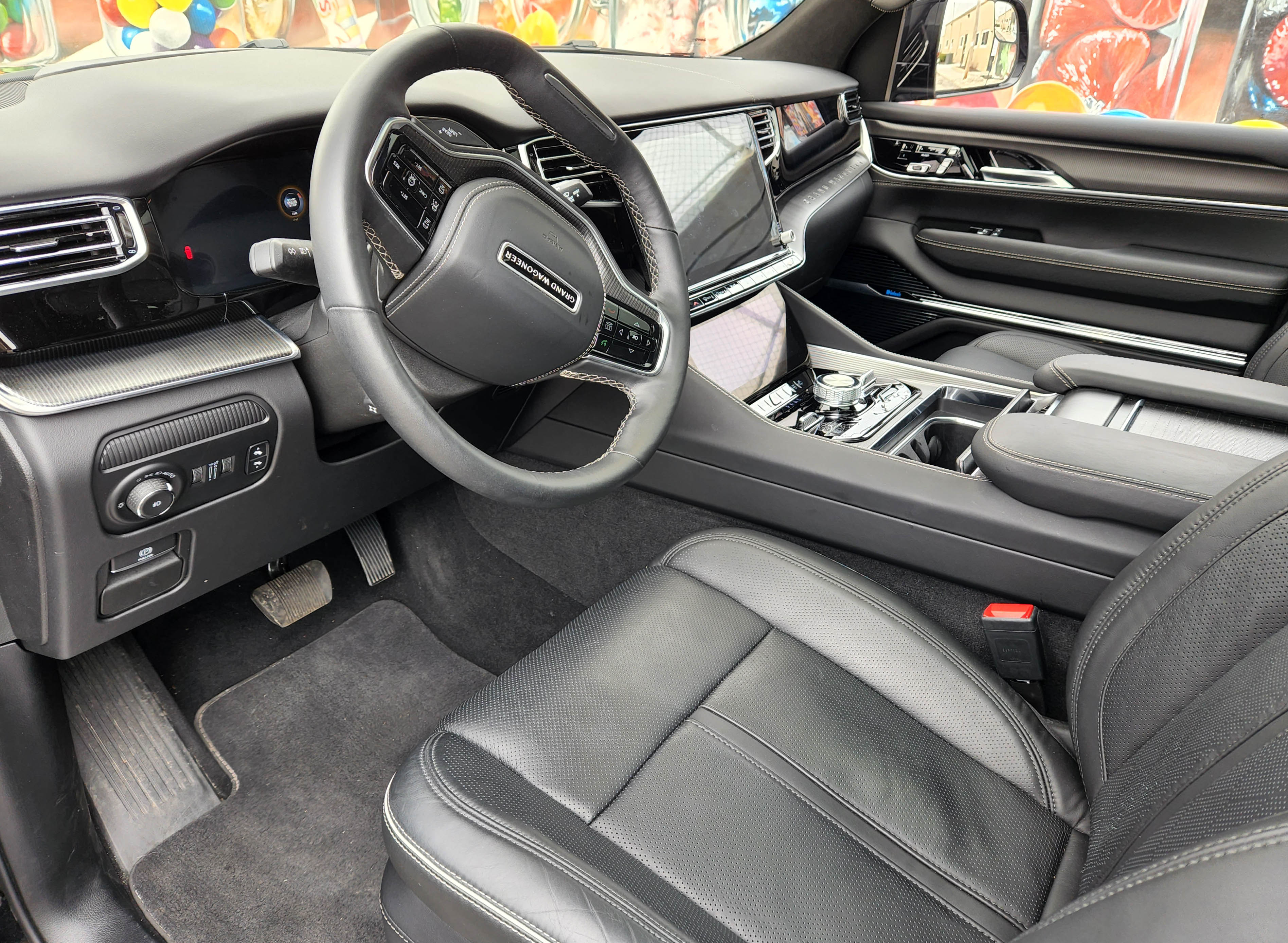 Hits: Plush, huge Jeep with off-road capability, five drive modes, powerful V8 with major tow ability, will carry up to 8 passengers. Giant sunroof plus smaller one for row 3, power hatch, the usual safety equipment and 4WD. Quiet interior with oodles of upgraded leather, heated/cooled front seats, heated steering wheel, heated/cooled second row seats. Power adjustable pedals and steering wheel, comfy seats, giant touchscreen. PLUS console cooler, massaging front seats, air suspension, 23-speaker stereo, giant touchscreen, screen for front passenger, entertainment screens for second row seats, and power retractable running boards.
