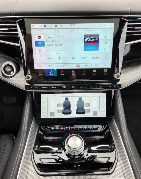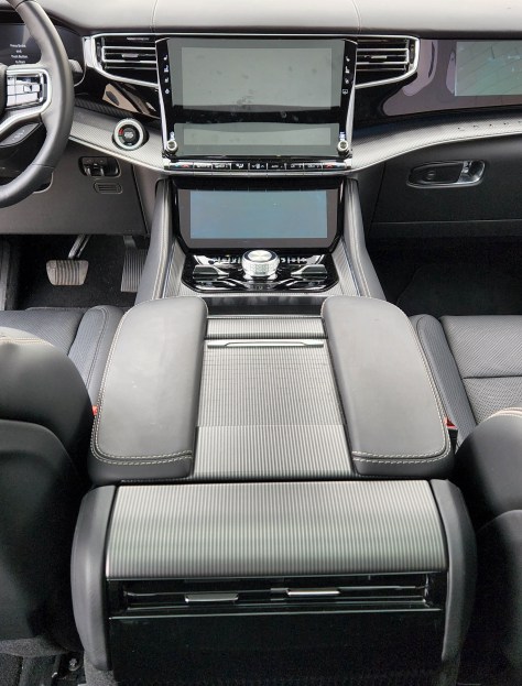 Mentioned the black leather interior a bit earlier, but I neglected to say the seats are nicely supportive and heated and cooled in the first two rows. But the front row also features massaging functions. Waterfall is my favorite massage pattern, but rock climb is good too. There are three others and three massage pressure levels for each too. Folks usually ooh and aah when they try these, but the message functions is mainly to stimulate a little blood flow to the extremities on a long drive. The message is not so relaxing as to make a driver drowsy. Controls for these are on the lower of the two center screens.